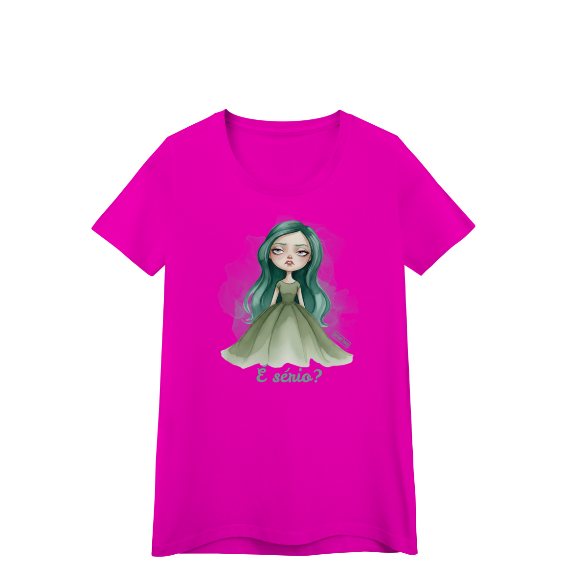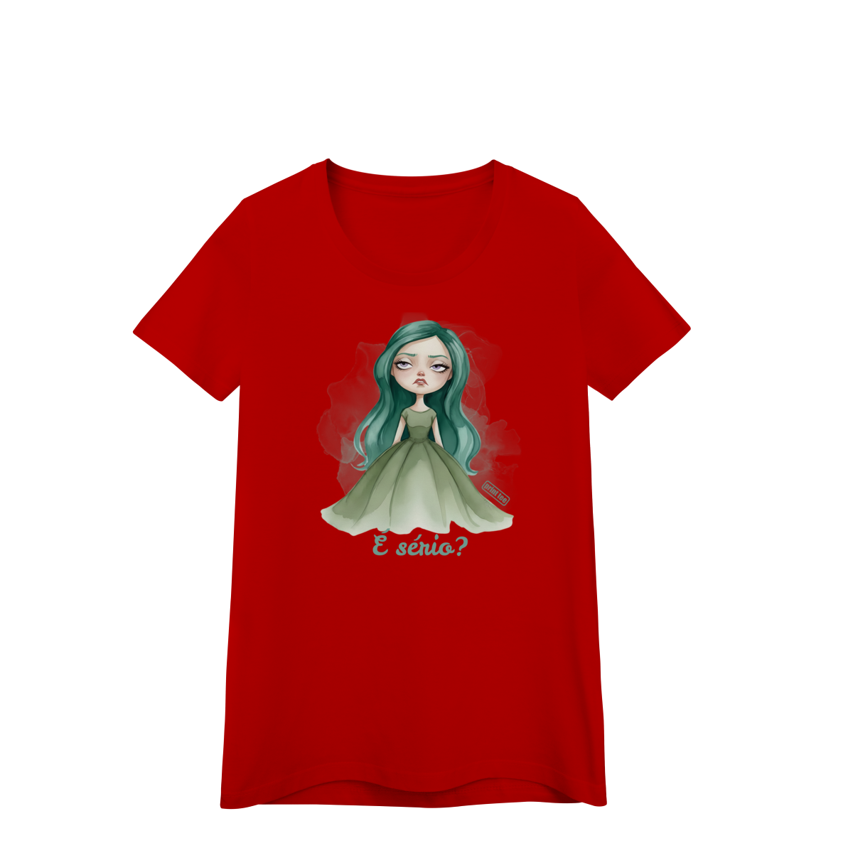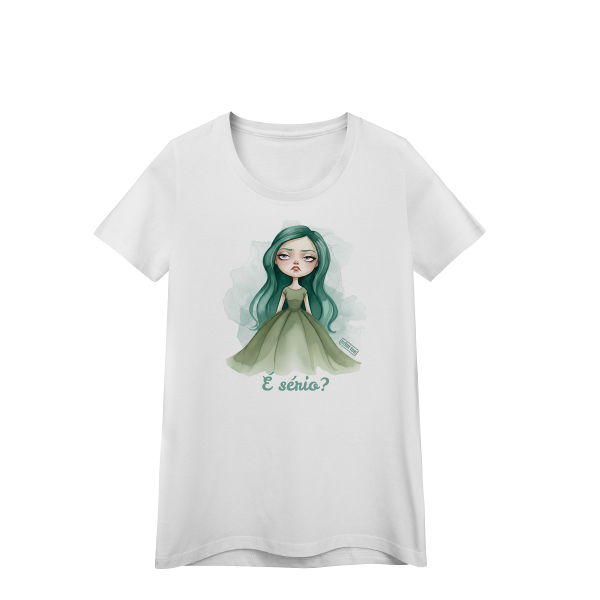 Essa camiseta tem uma energia de "eu não saio de casa para isso" que é simplesmente fantástica. O contraste entre o estilo delicado da ilustração e a expressão de puro deboche cria uma peça cheia de personalidade.