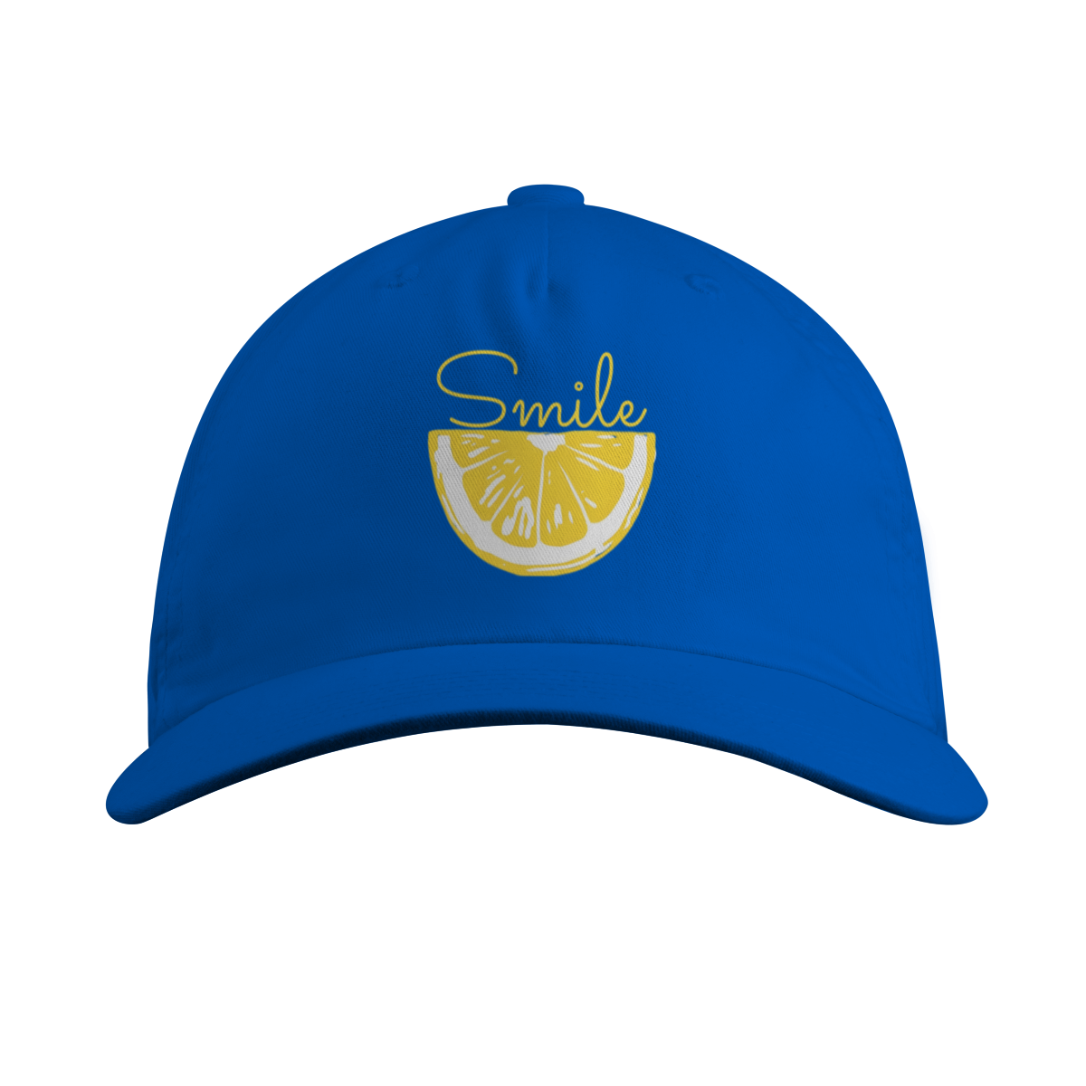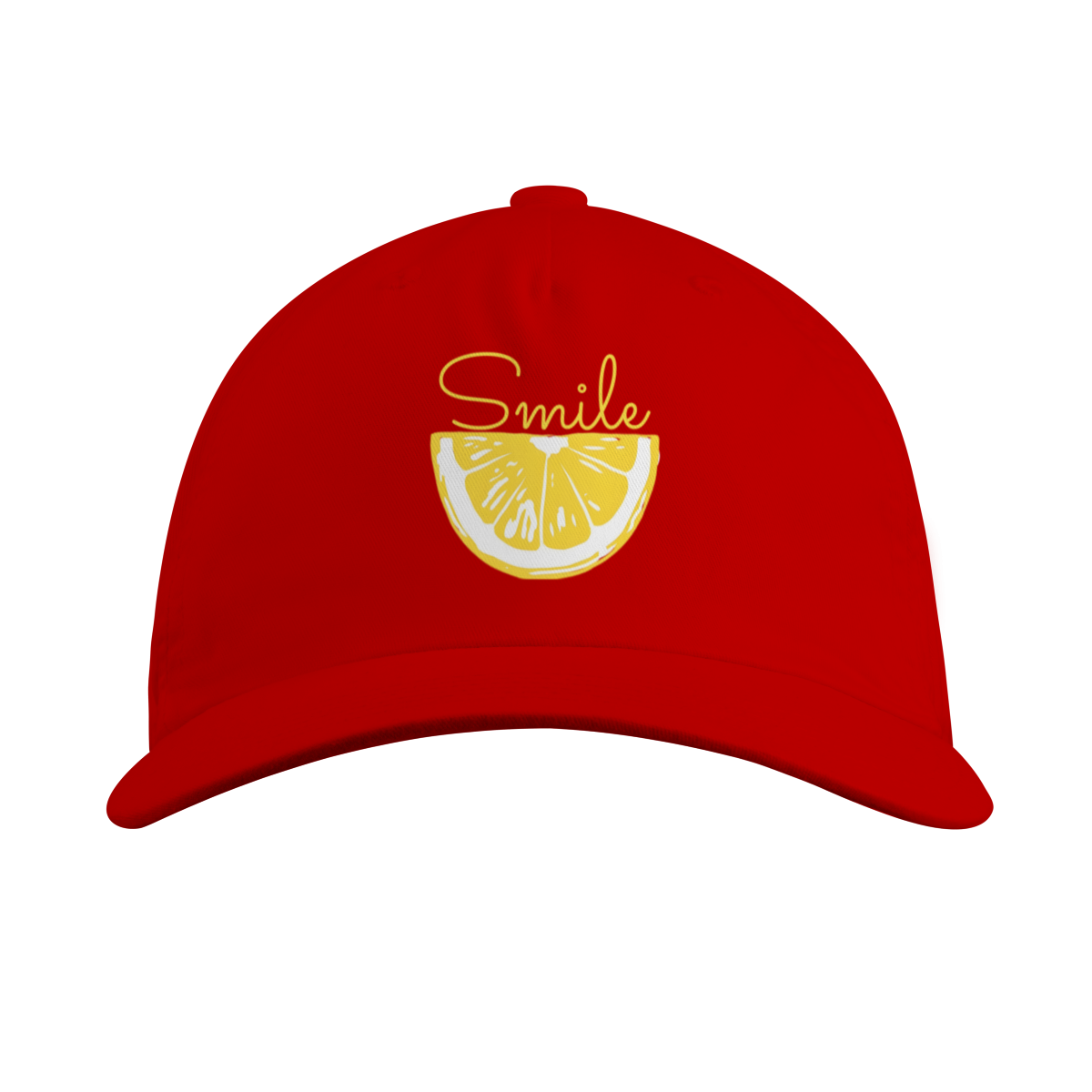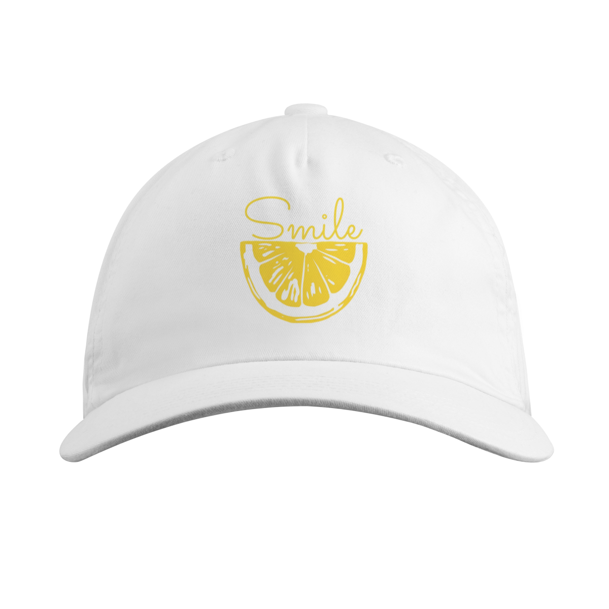 Este boné apresenta um design minimalista e moderno, unindo a sofisticação do preto com a energia vibrante do amarelo cítrico. No centro, uma fatia de limão detalhada serve como a base para a palavra "Smile" em uma caligrafia fluida, criando uma composição visual leve e divertida.