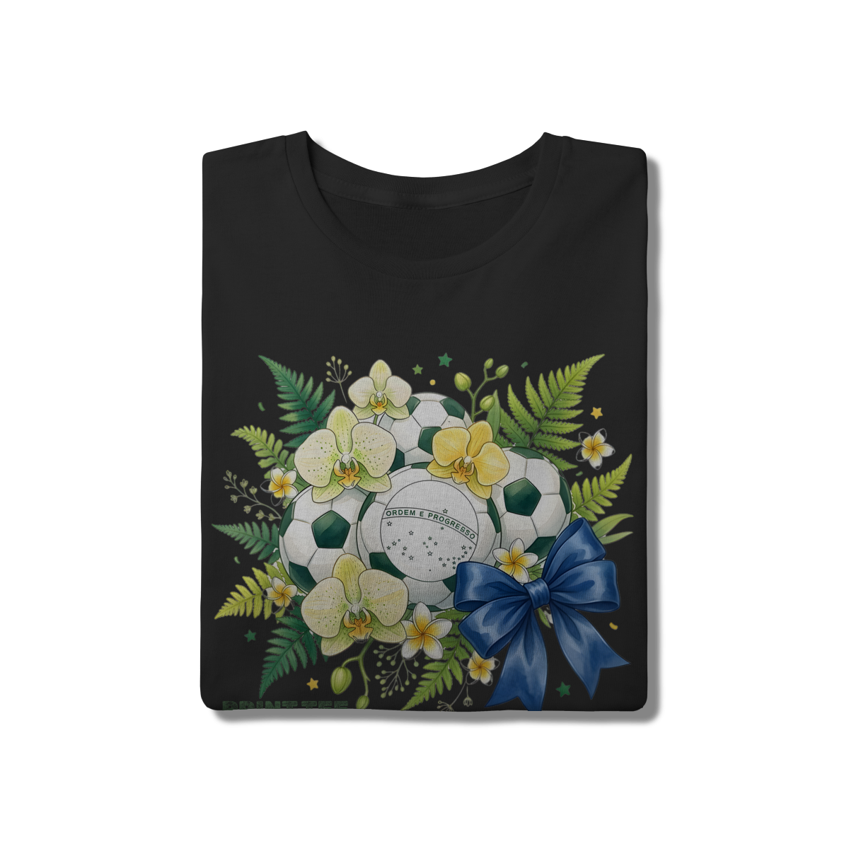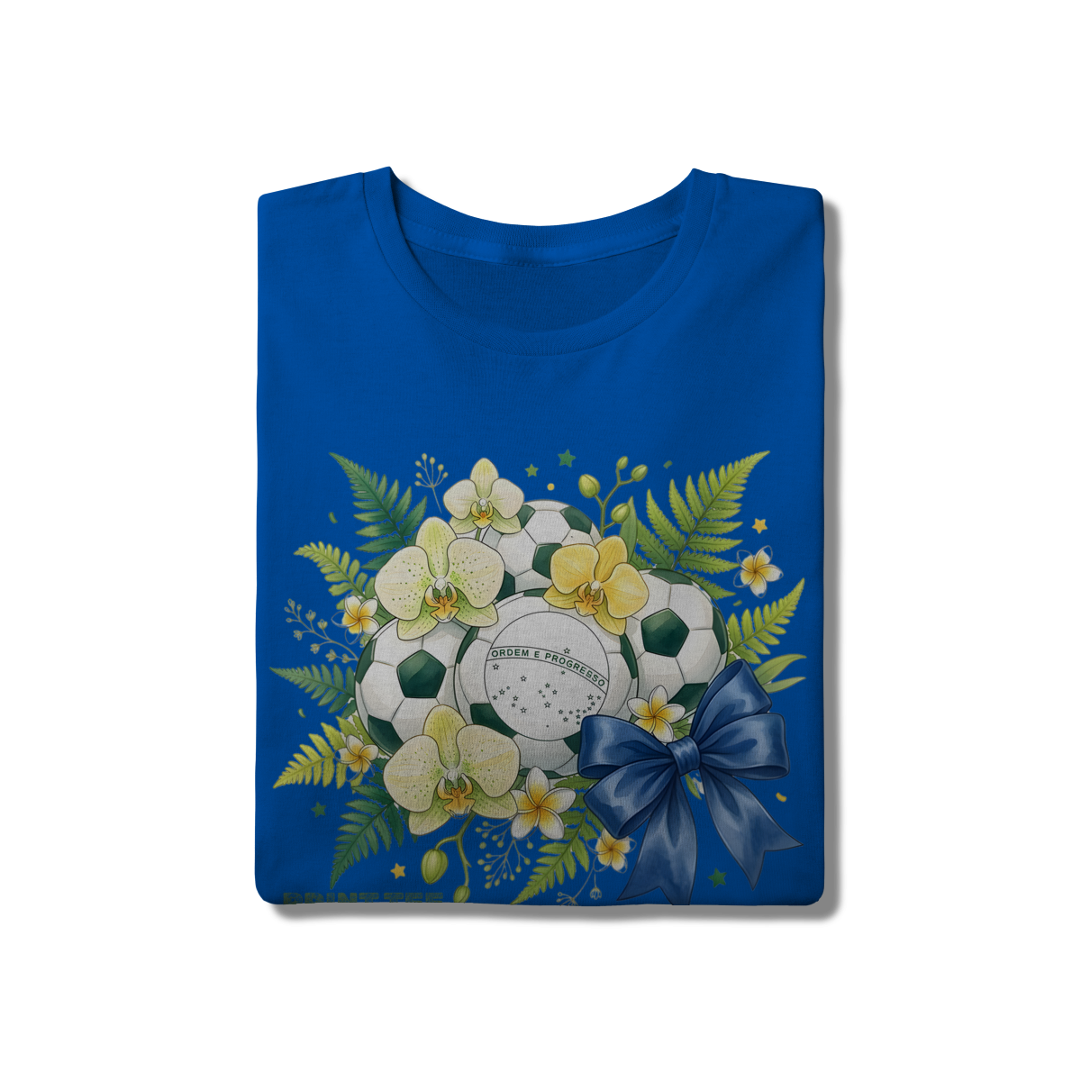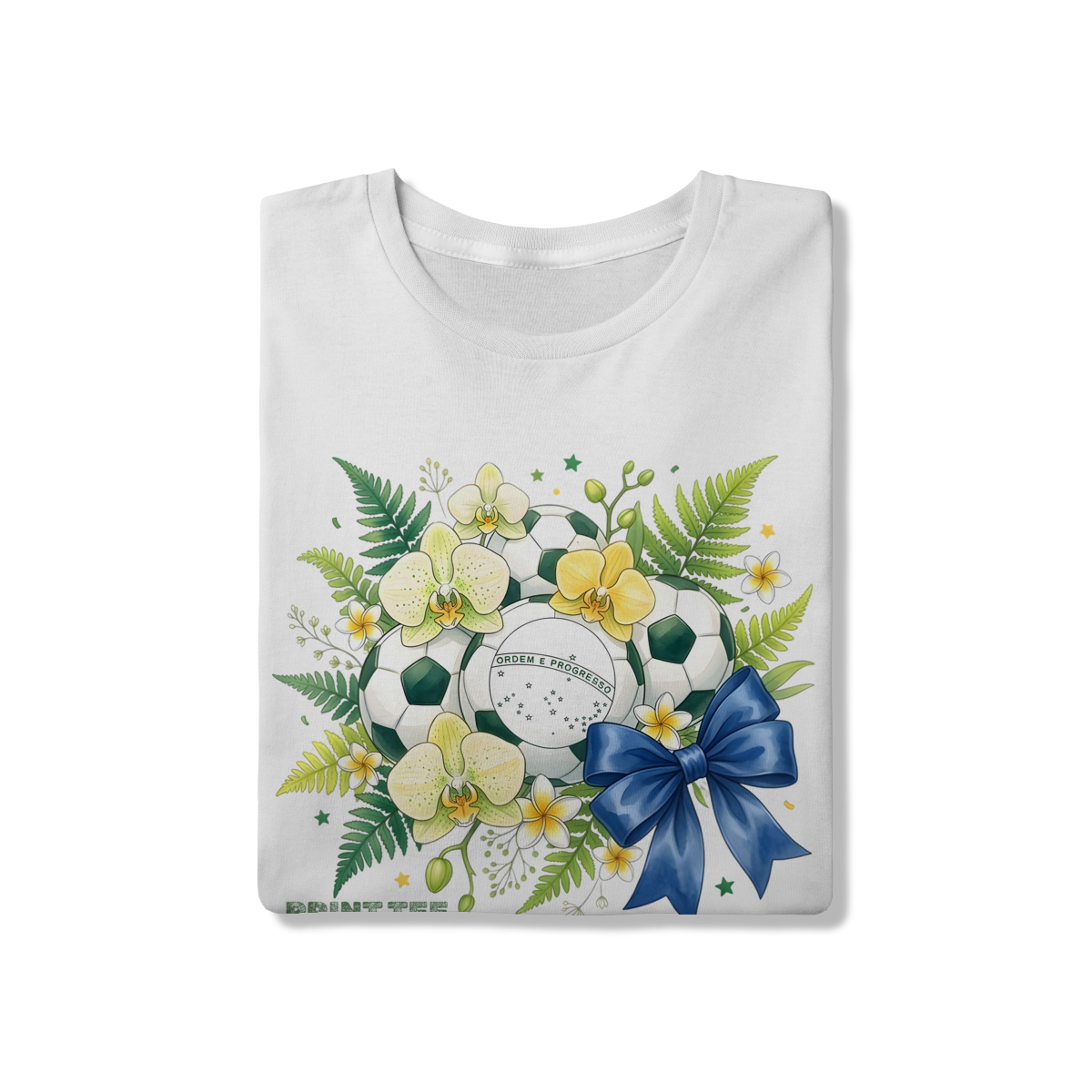 Descrição: Uma peça de vestuário única que une a paixão pelo futebol com a beleza da natureza tropical brasileira. Esta t-shirt branca apresenta uma estampa vibrante com bolas de futebol decoradas com orquídeas amarelas e brancas, samambaias verdes e a inscrição "ORDEM E PROGRESSO", representando a identidade nacional. O laço azul adiciona um toque final de elegância e charme, tornando-a uma escolha ideal para torcer pelo Brasil com estilo e sofisticação.