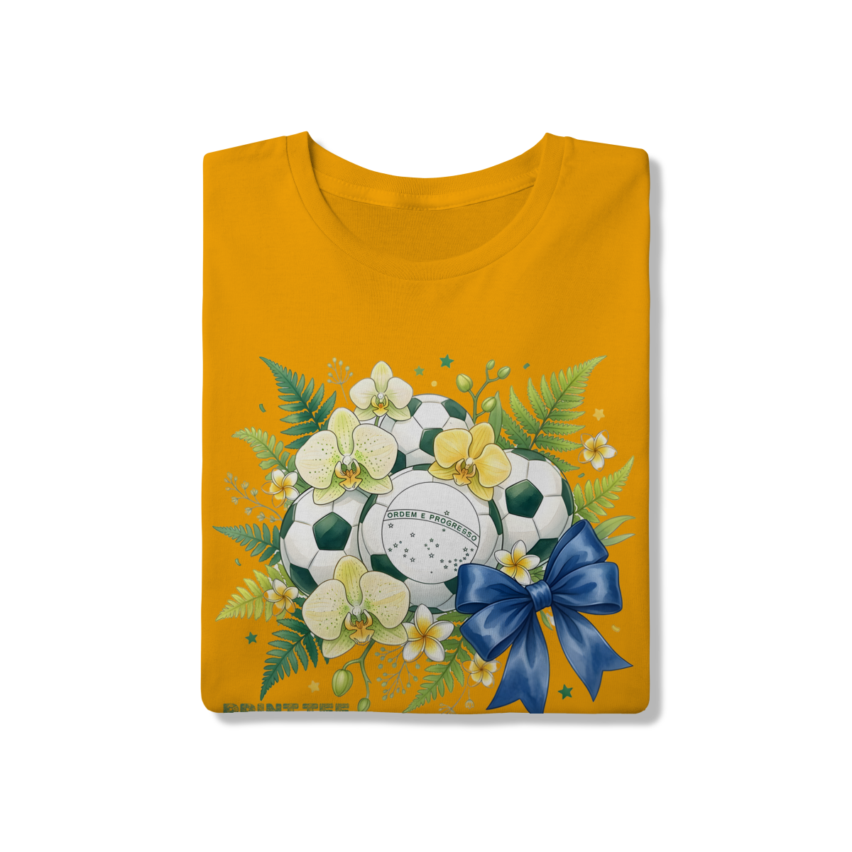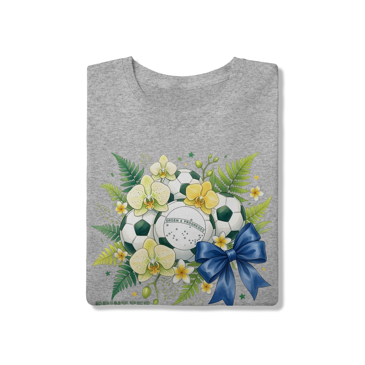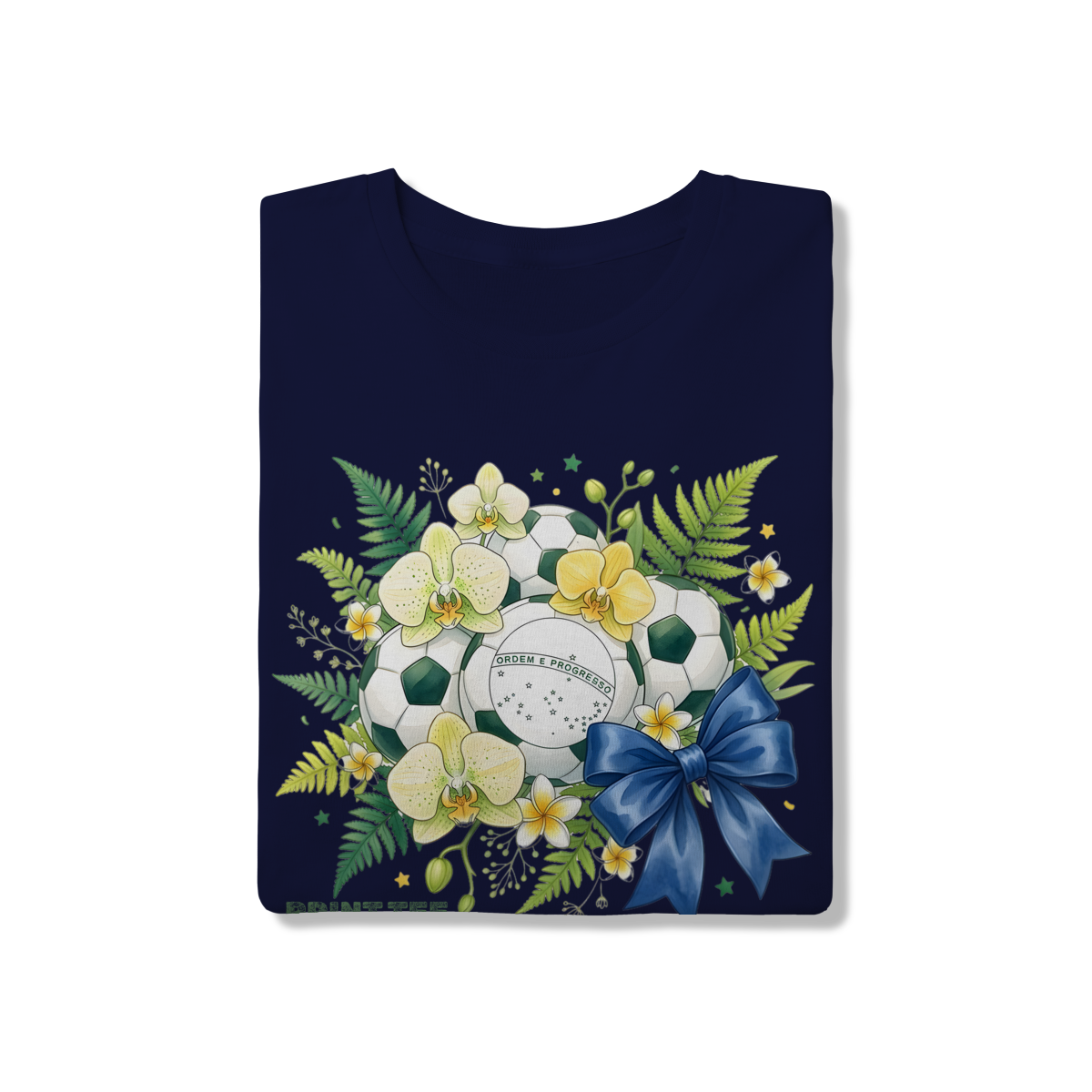 Descrição: Uma peça de vestuário única que une a paixão pelo futebol com a beleza da natureza tropical brasileira. Esta t-shirt branca apresenta uma estampa vibrante com bolas de futebol decoradas com orquídeas amarelas e brancas, samambaias verdes e a inscrição "ORDEM E PROGRESSO", representando a identidade nacional. O laço azul adiciona um toque final de elegância e charme, tornando-a uma escolha ideal para torcer pelo Brasil com estilo e sofisticação.