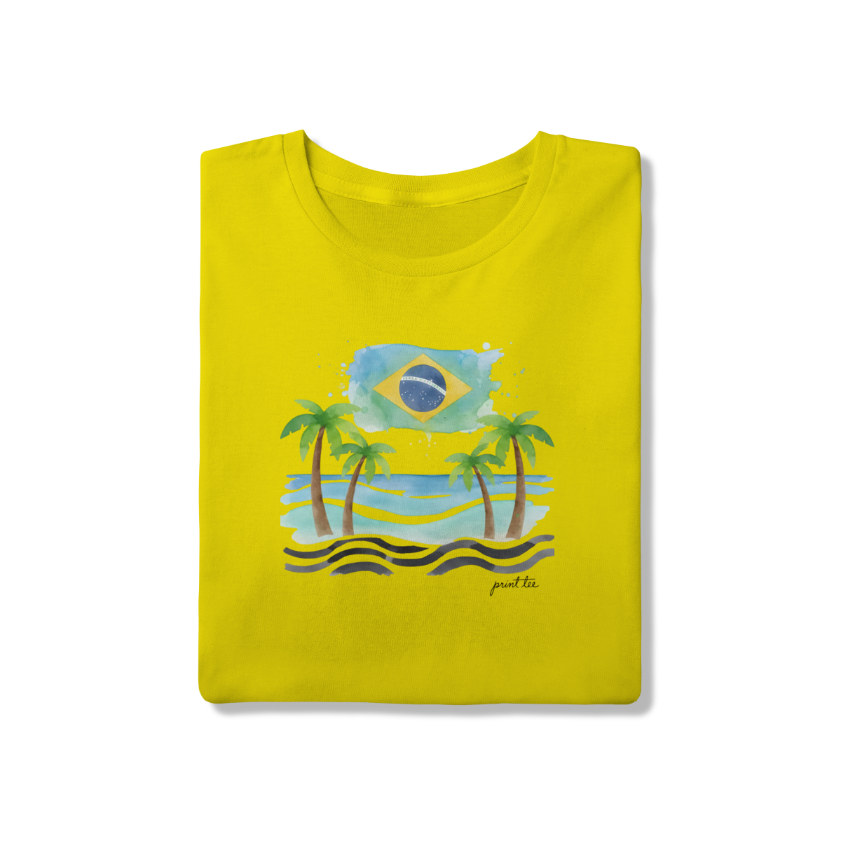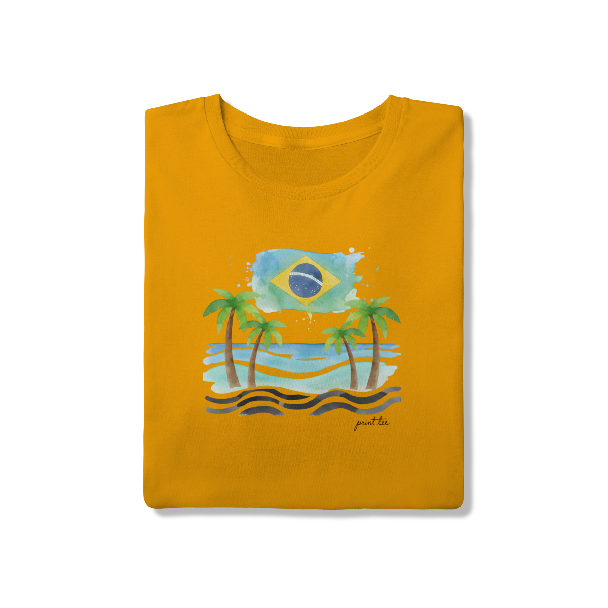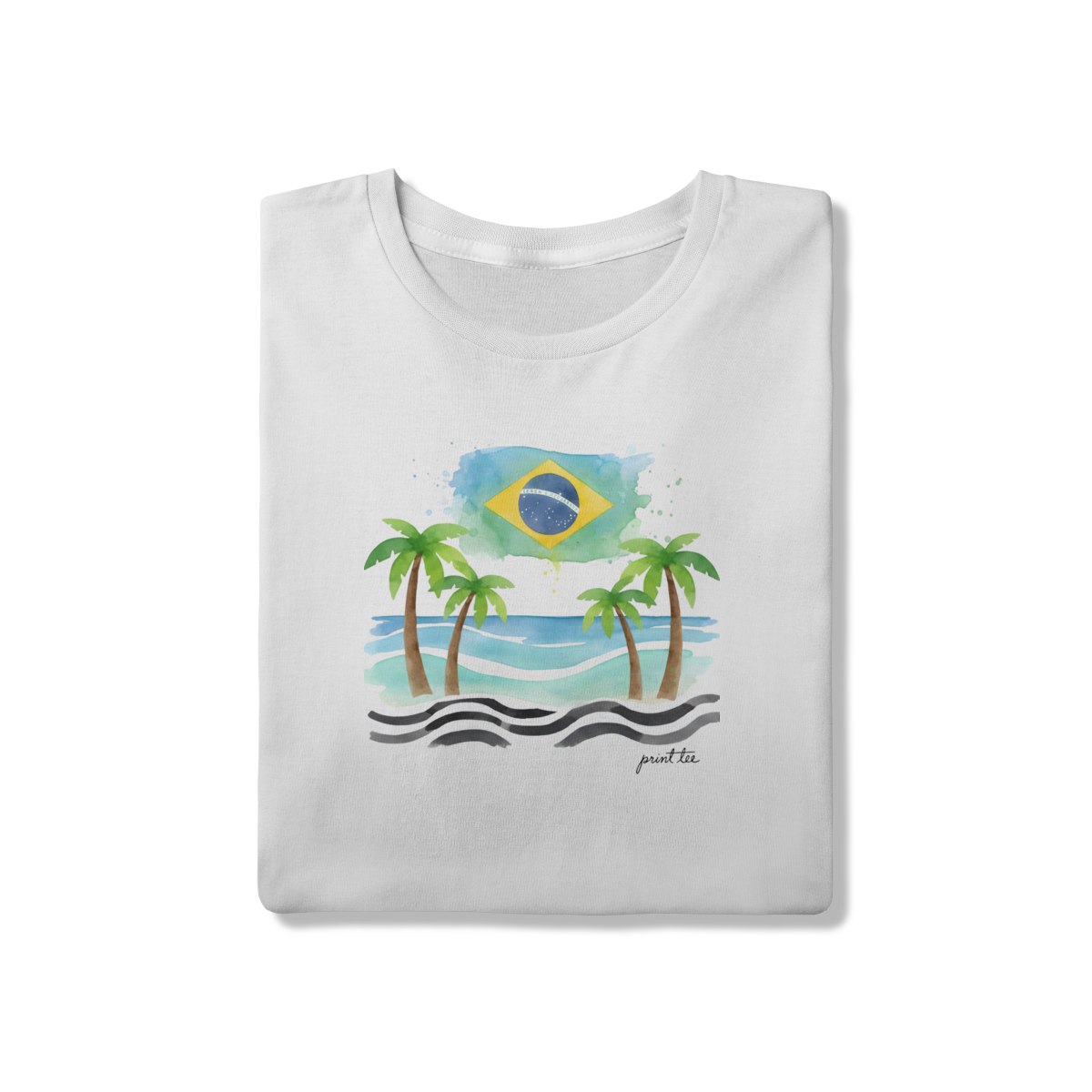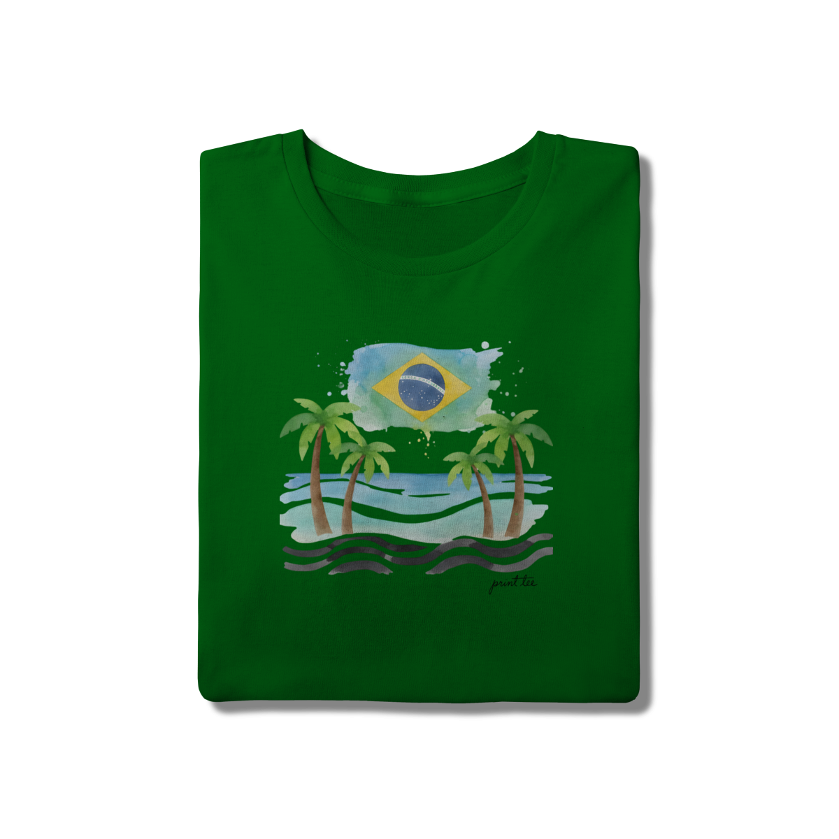 Descrição: Sinta a energia do litoral brasileiro com a nossa Camiseta Aquarela Brasil Tropical. Com uma estampa artística exclusiva que mistura a bandeira nacional a um cenário paradisíaco de palmeiras e mar, esta peça é perfeita para quem busca um visual autêntico e relaxado. O tom azul profundo destaca os detalhes em aquarela, criando um contraste moderno e cheio de vida.