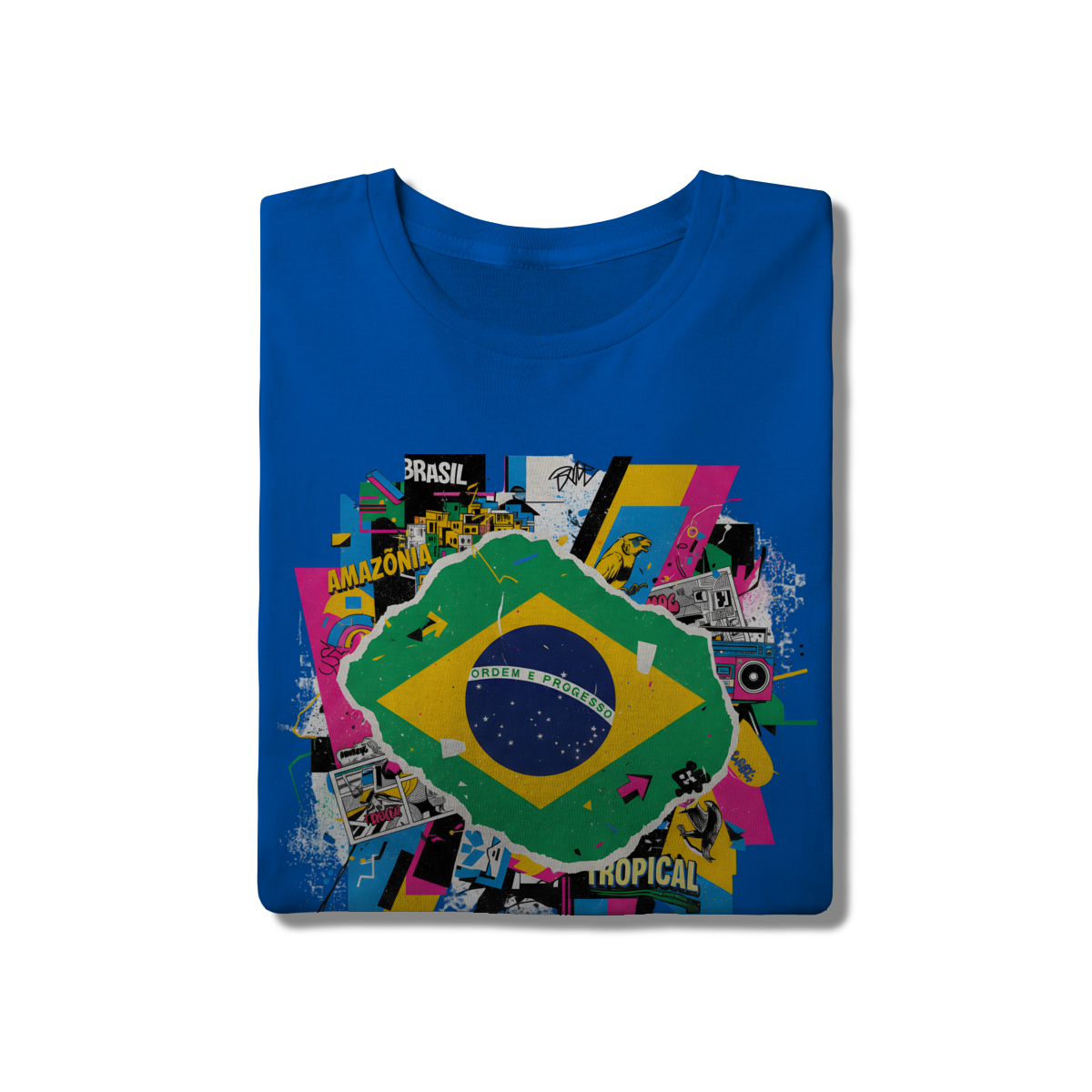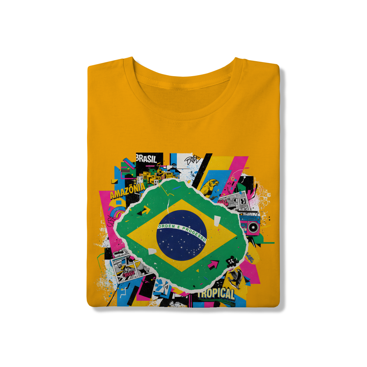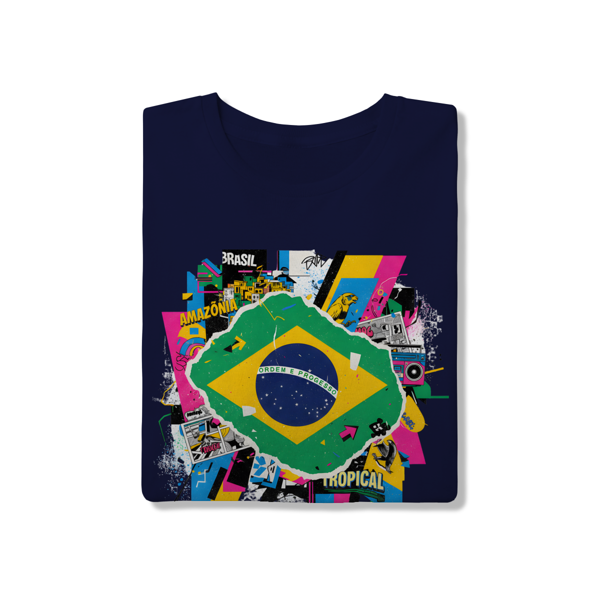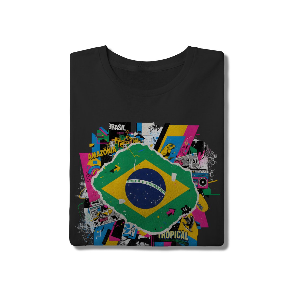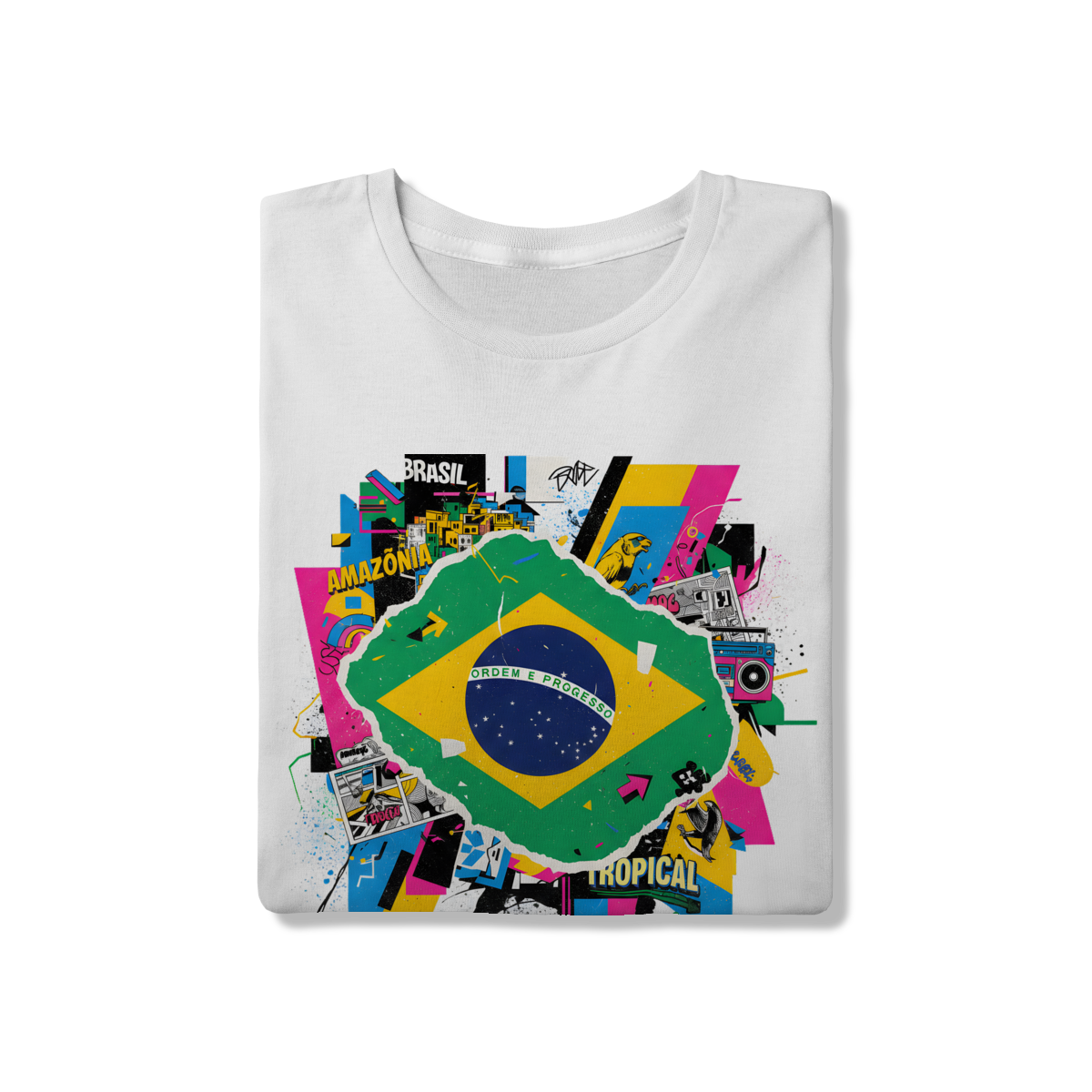 Abraçe a energia vibrante do Brasil com a Camiseta "Brasil Pulsação Tropical". Esta peça une o estilo urbano do street art com a exuberância da natureza brasileira em um collage arrojado e cheio de cor.
