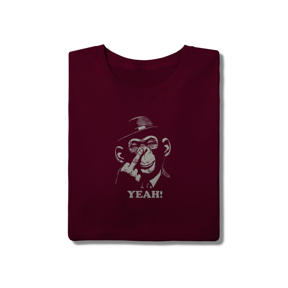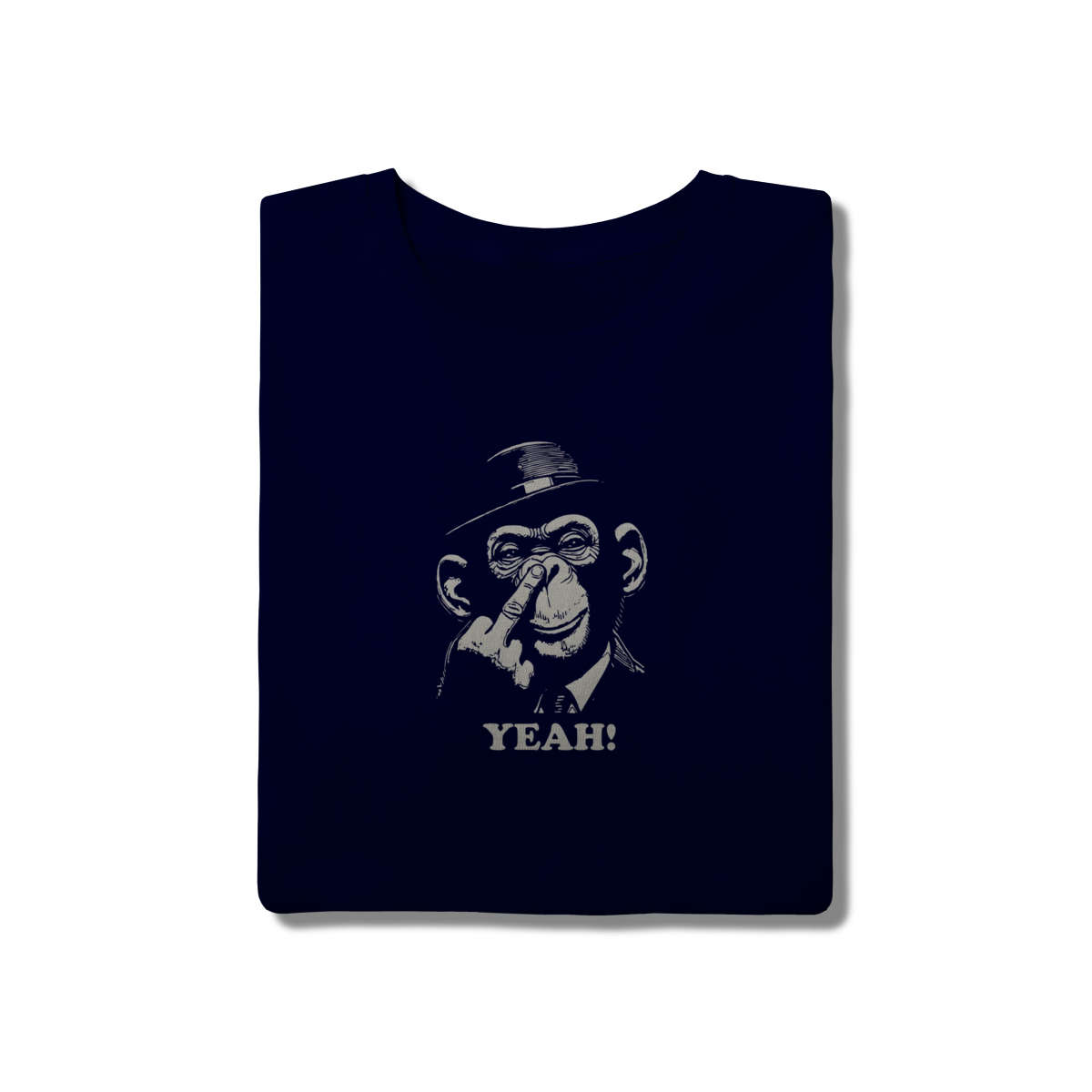 Esta peça apresenta uma arte vintage e irônica de um chimpanzé bem-vestido (com um elegante chapéu fedora) fazendo um gesto atrevido com o dedo. A palavra "YEAH!" reforça o tom de desafio bem-humorado.