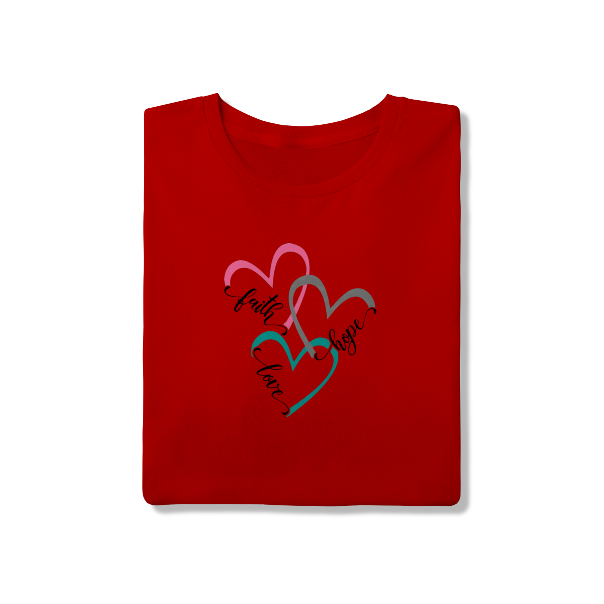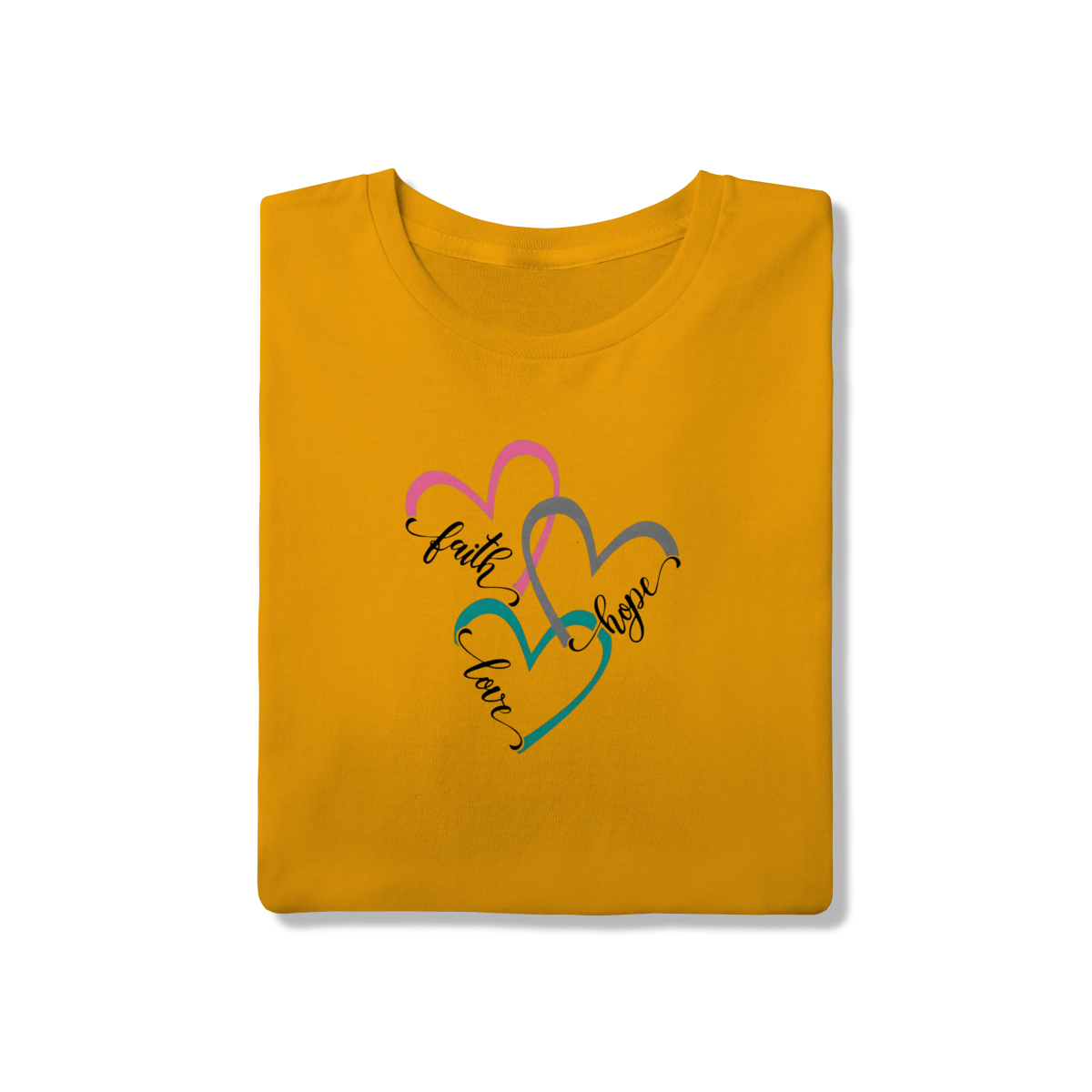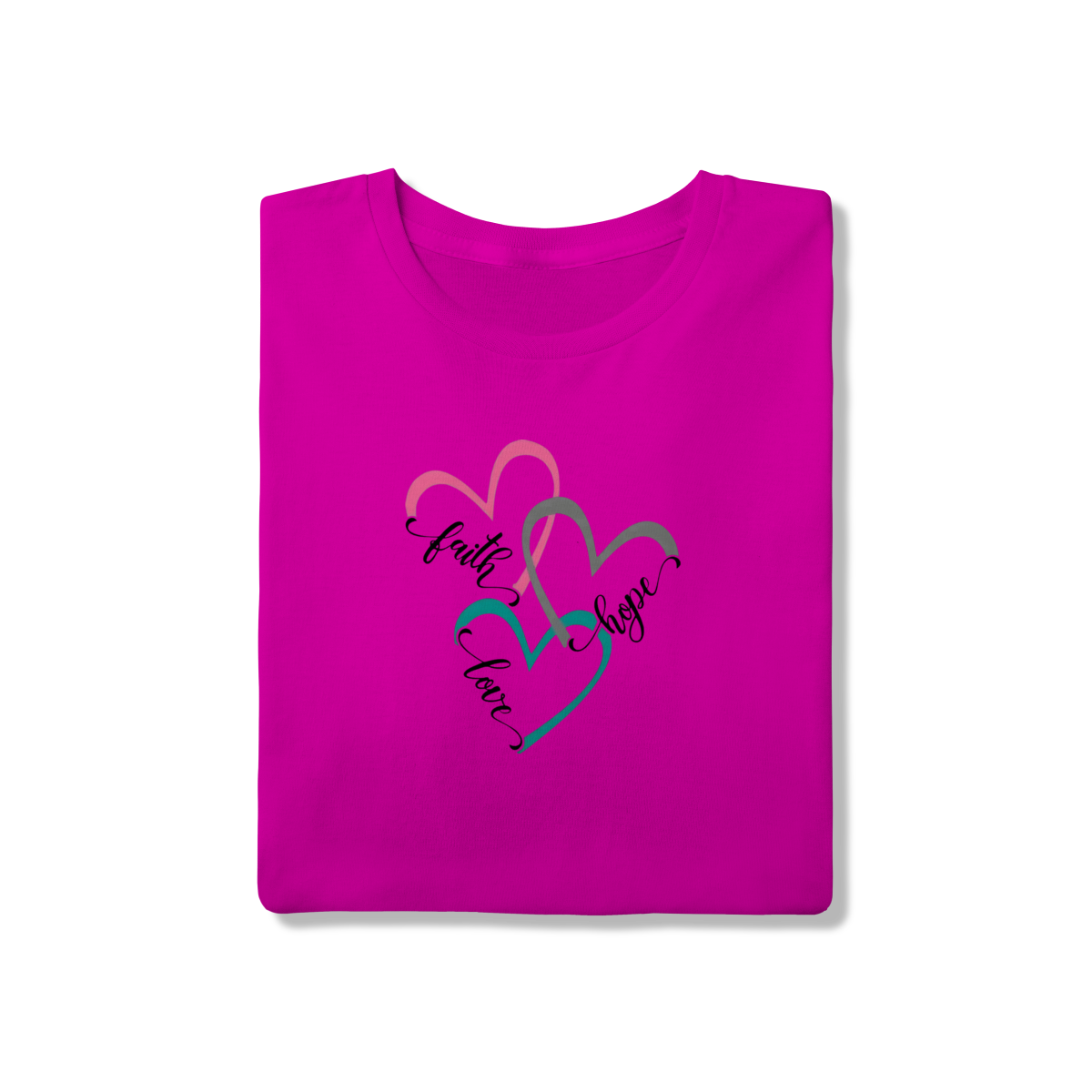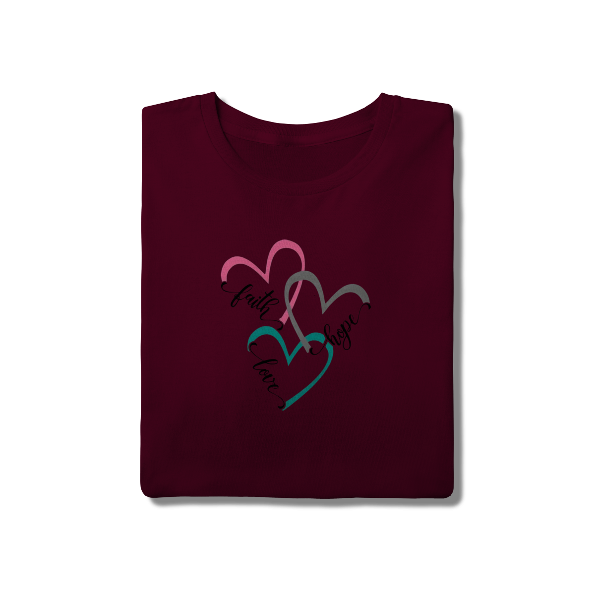 Celebre os pilares da vida com a nossa camiseta Coração Tríplice: Fé, Esperança e Amor.