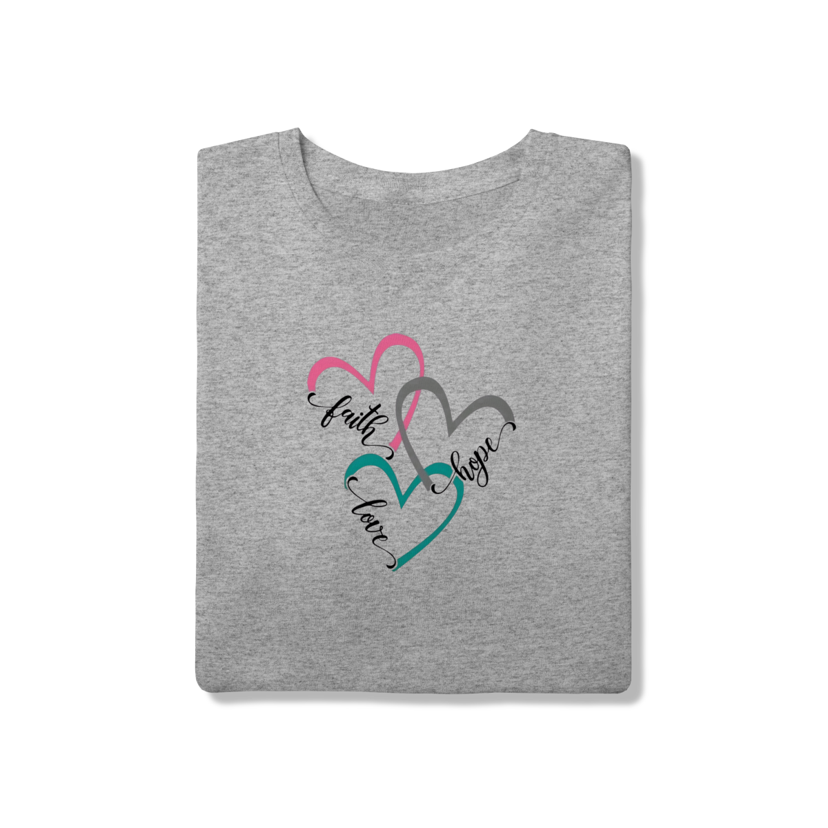 Este design delicado apresenta três corações entrelaçados em tons de rosa, cinza e turquesa, cada um escrito com uma virtude essencial em uma caligrafia elegante: , Esperança e Amor.