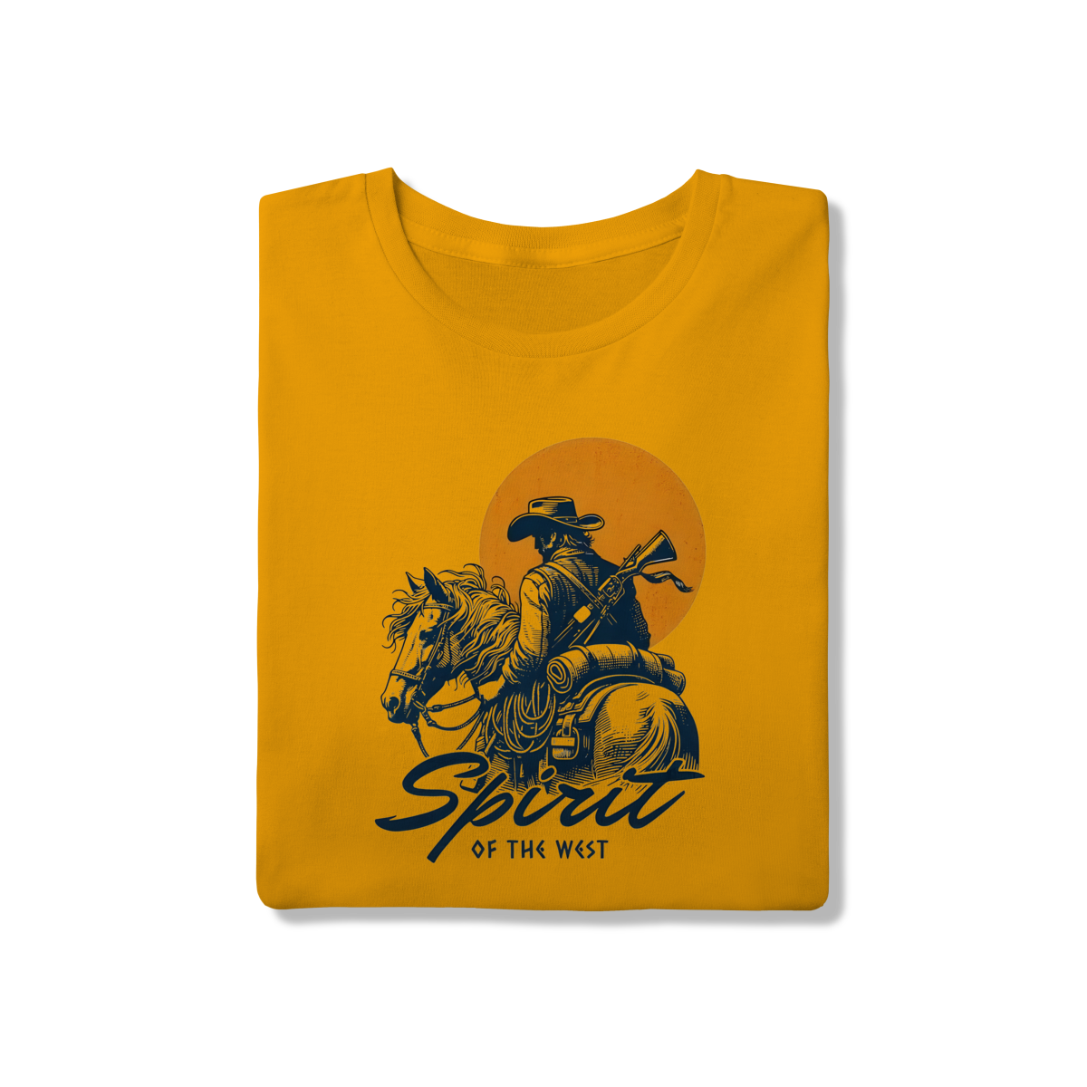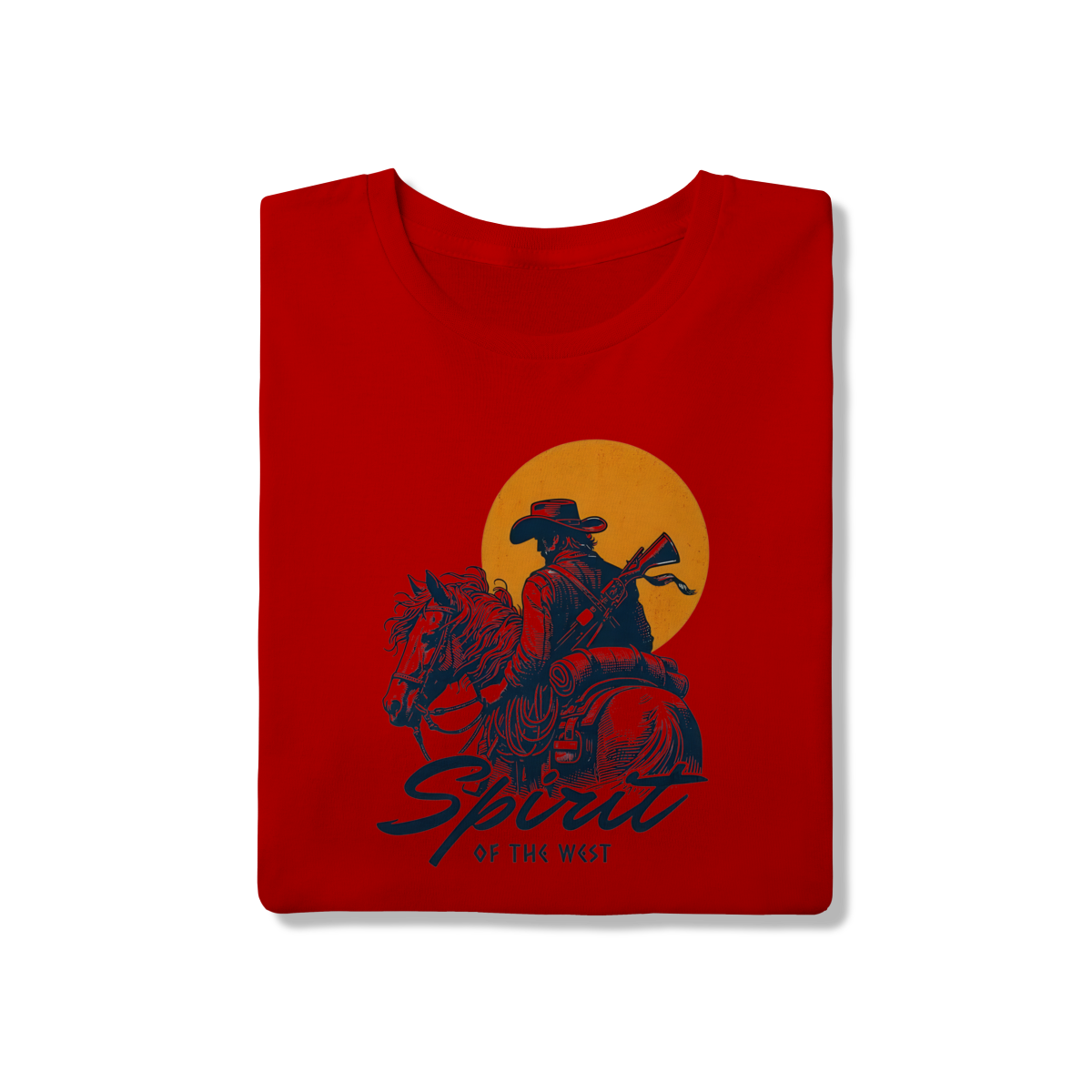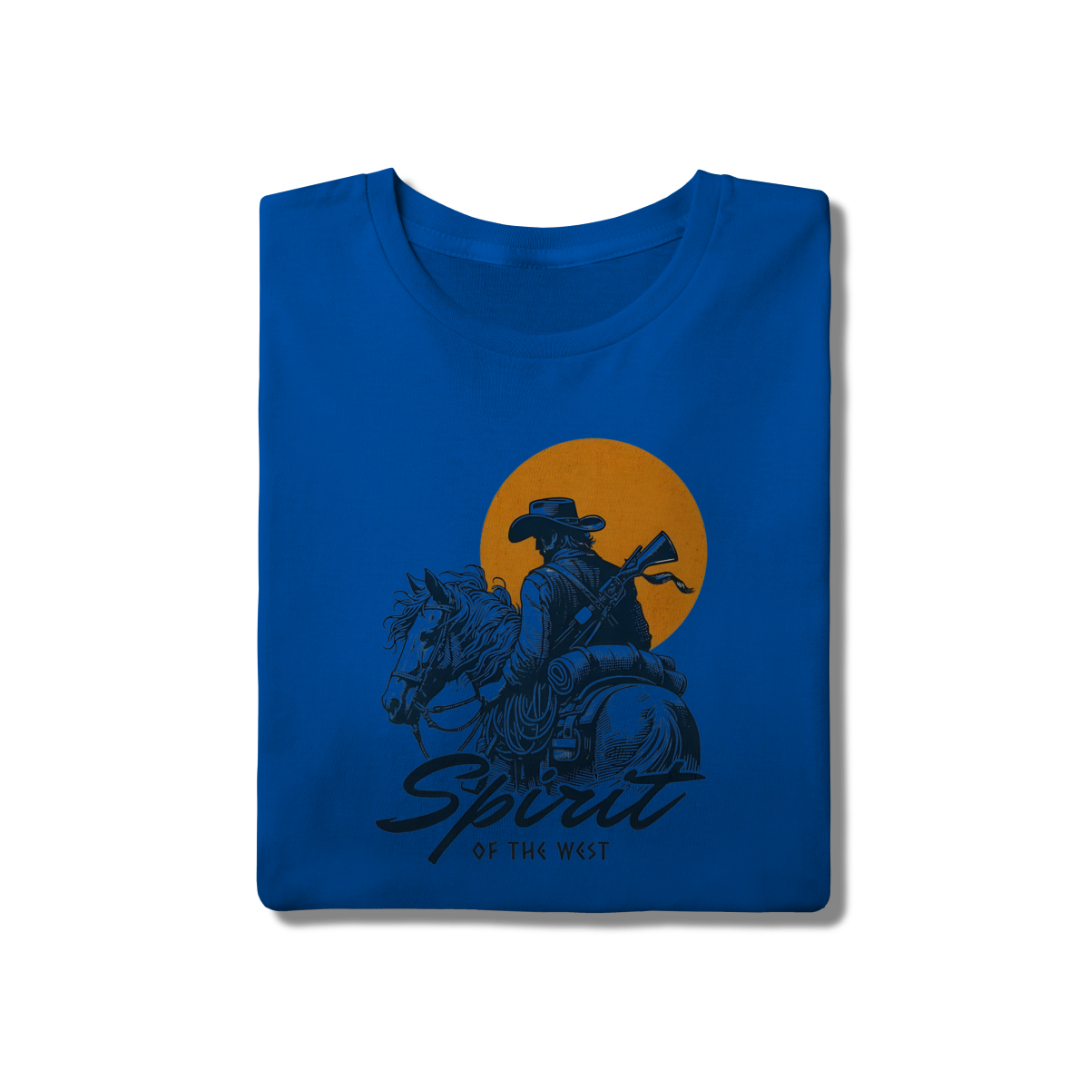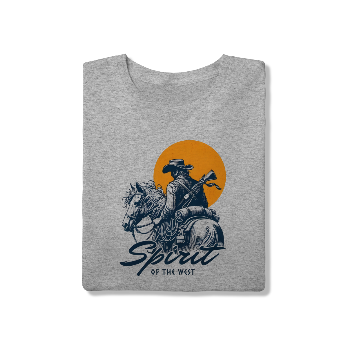 • Mensagem Poderosa: O texto "Spirit of the West" (Espírito do Oeste) complementa a imagem, celebrando a coragem, o desbravamento e a jornada.