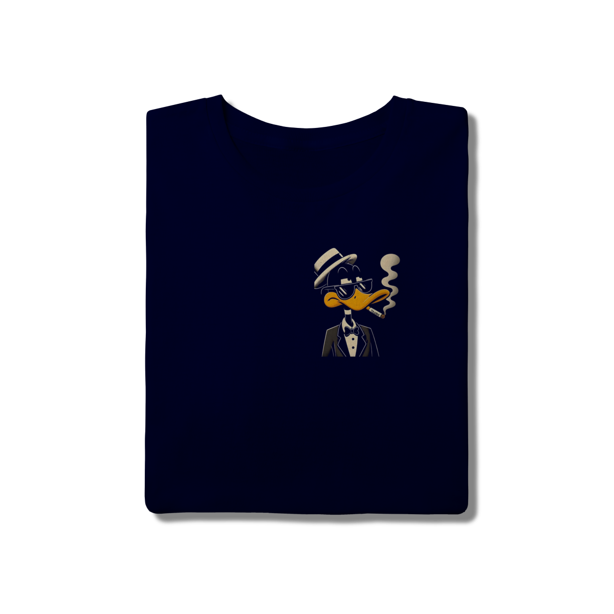 "Apresentamos a camiseta 'Dapper Duck', uma peça que combina estilo e um toque de irreverência. Estampando um pato estiloso com chapéu, óculos e um charuto, esta camiseta é perfeita para quem gosta de se destacar com bom humor e sofisticação. Feita com tecido 100% algodão de alta qualidade, oferece conforto e durabilidade. Seja para um encontro casual ou para adicionar um toque de personalidade ao seu dia a dia, a 'Dapper Duck' é a escolha ideal para quem não tem medo de mostrar seu lado único. Vista a diversão, vista o estilo!"