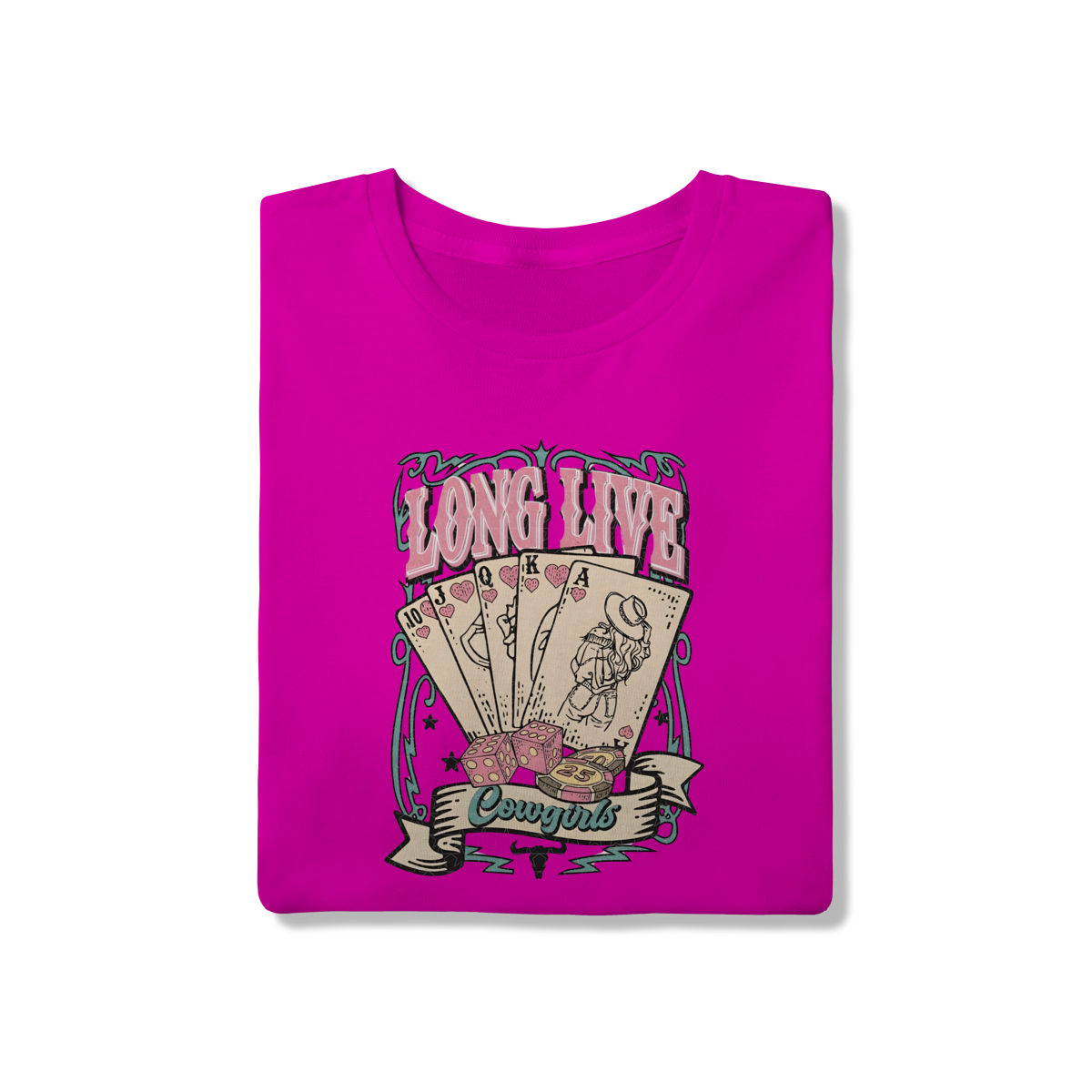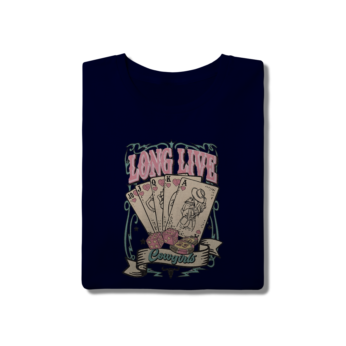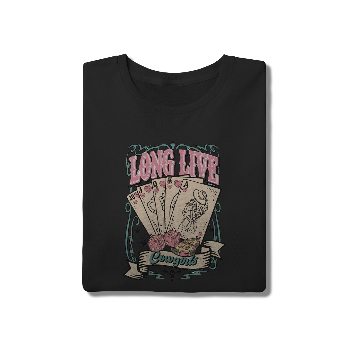 Entre no espírito do Oeste com um toque vintage e feminino! Nossa Camiseta "Long Live Cowgirls" é a peça perfeita para quem ama a estética country, jogos de azar e um design retrô.