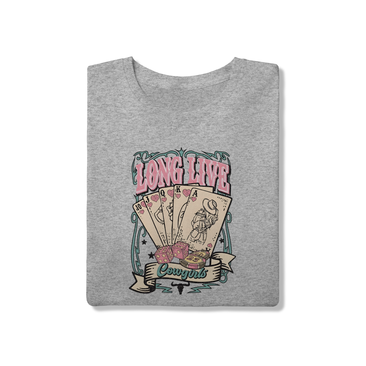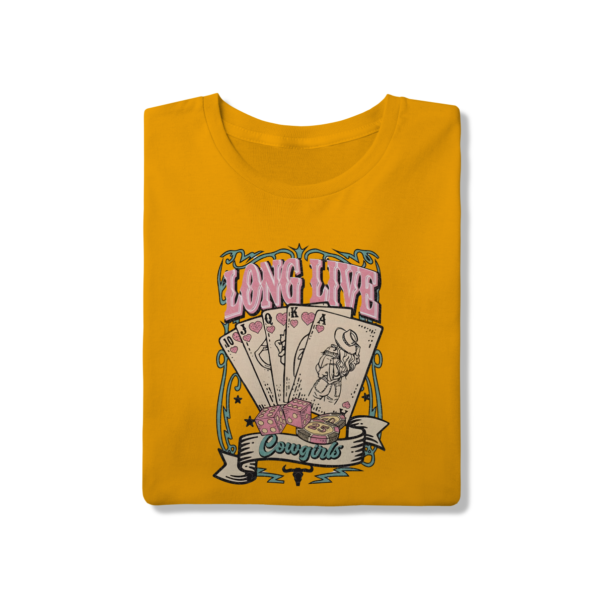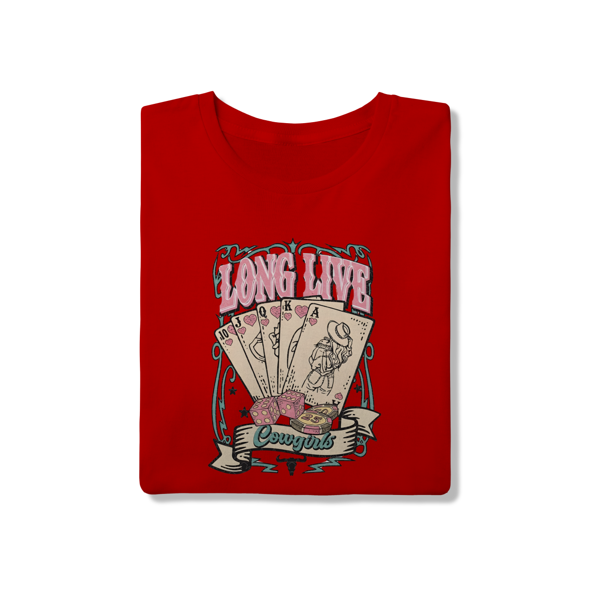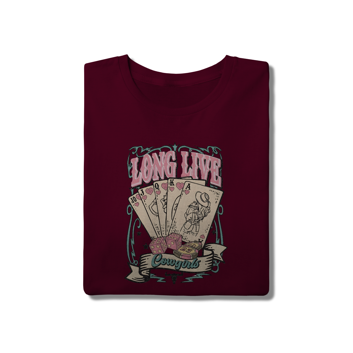 Entre no espírito do Oeste com um toque vintage e feminino! Nossa Camiseta "Long Live Cowgirls" é a peça perfeita para quem ama a estética country, jogos de azar e um design retrô.