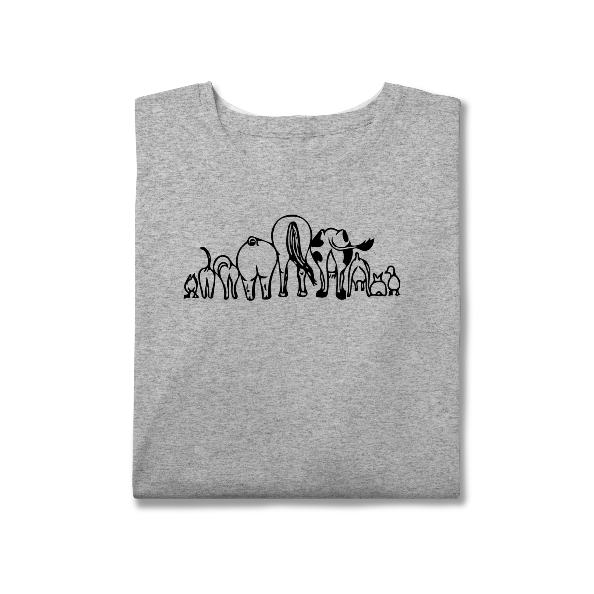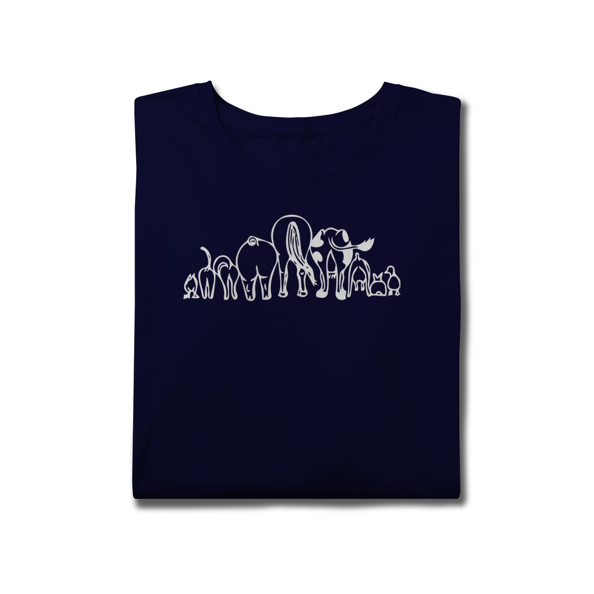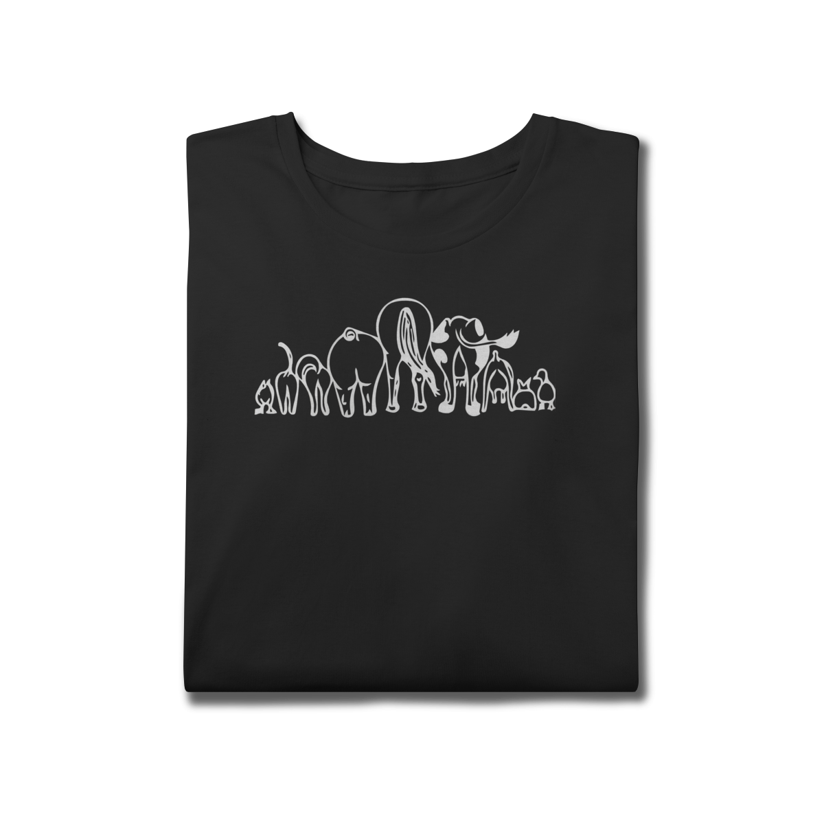 • Design Único: Uma estampa em linha branca fina (silhueta) apresenta as traseiras de uma variedade de animais, desde gatos e porcos até um cavalo ou elefante central, lado a lado. É uma visão adoravelmente peculiar da "natureza" em grupo!