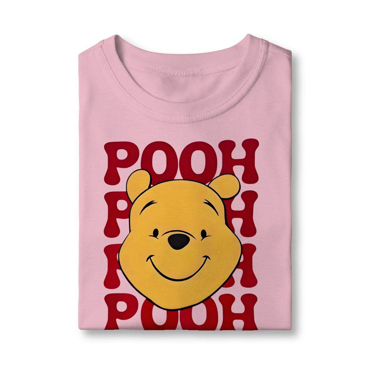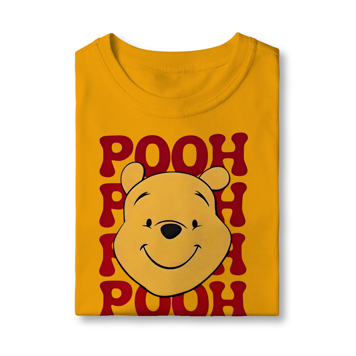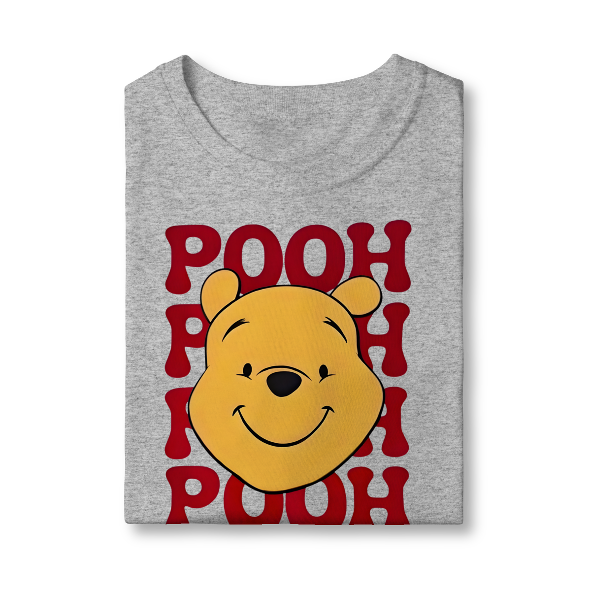 • Design Clássico: O icônico rosto sorridente de Pooh em destaque, com um fundo dinâmico e repetitivo da palavra "POOH" em vermelho vivo.
