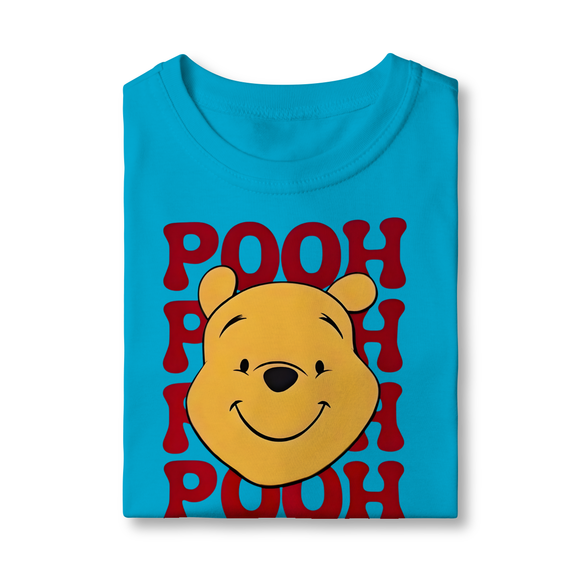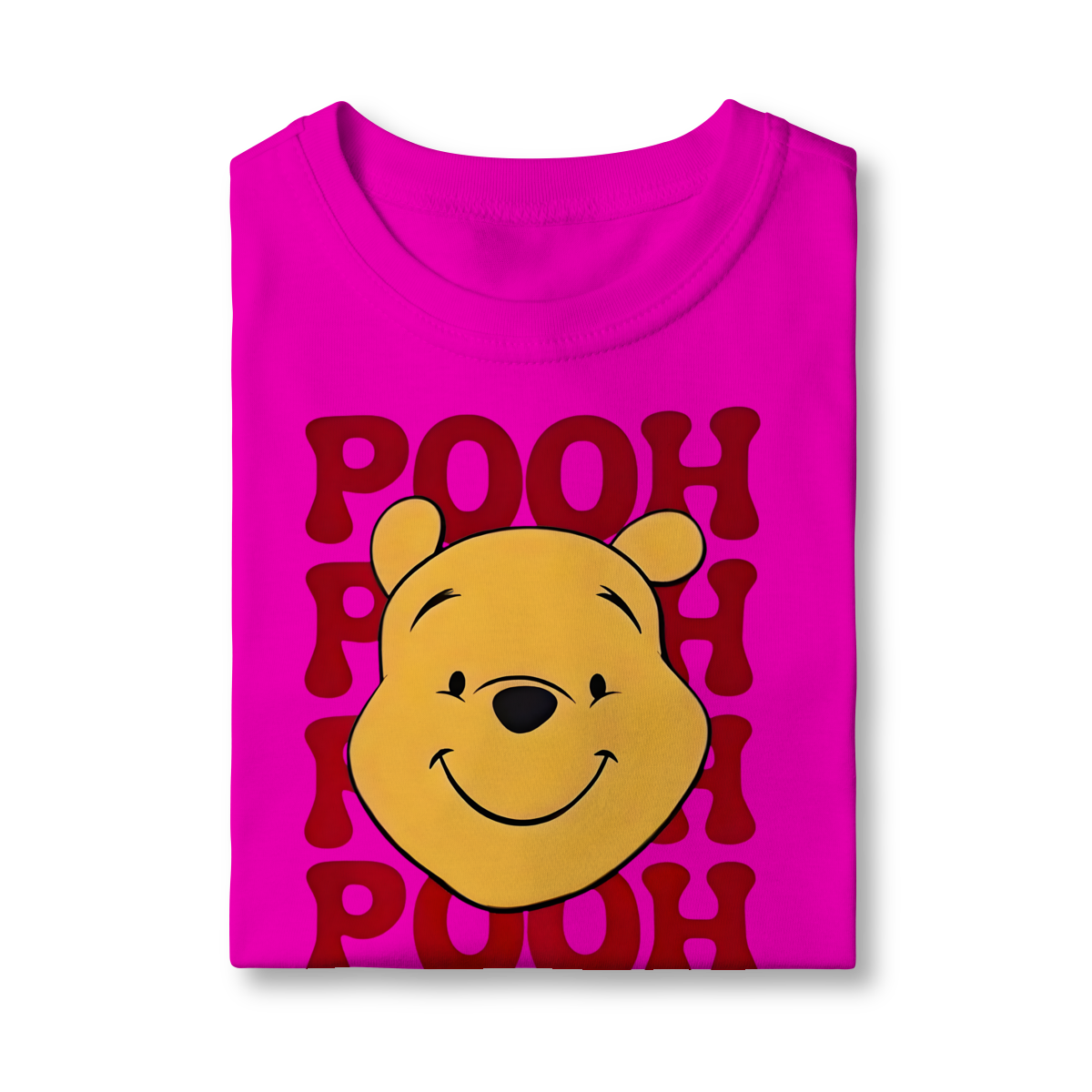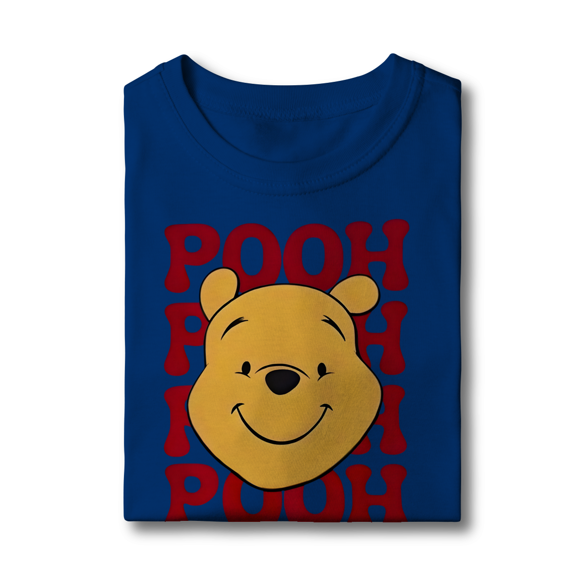 • Design Clássico: O icônico rosto sorridente de Pooh em destaque, com um fundo dinâmico e repetitivo da palavra "POOH" em vermelho vivo.