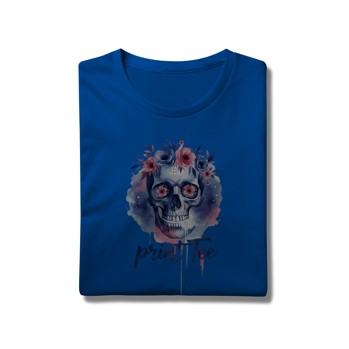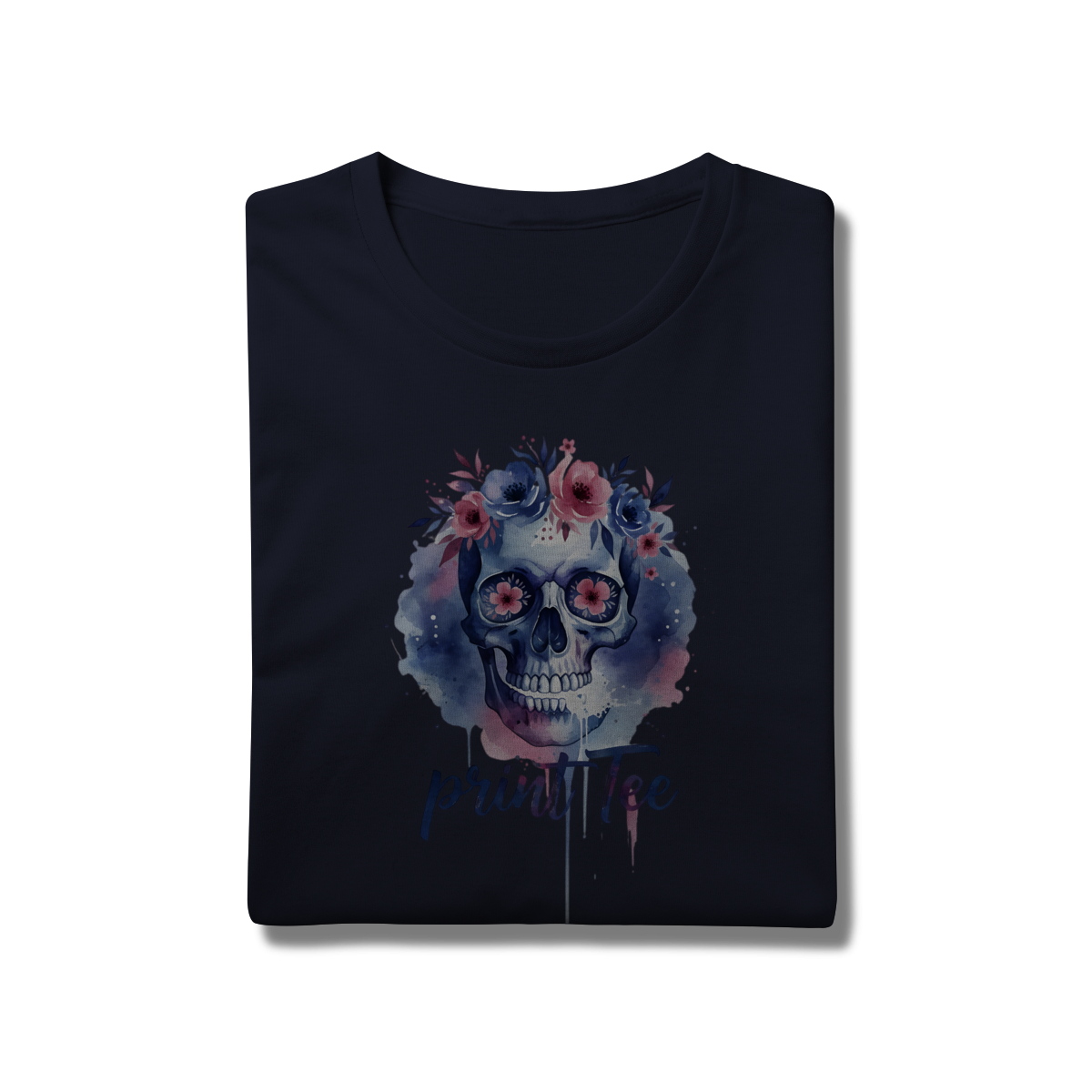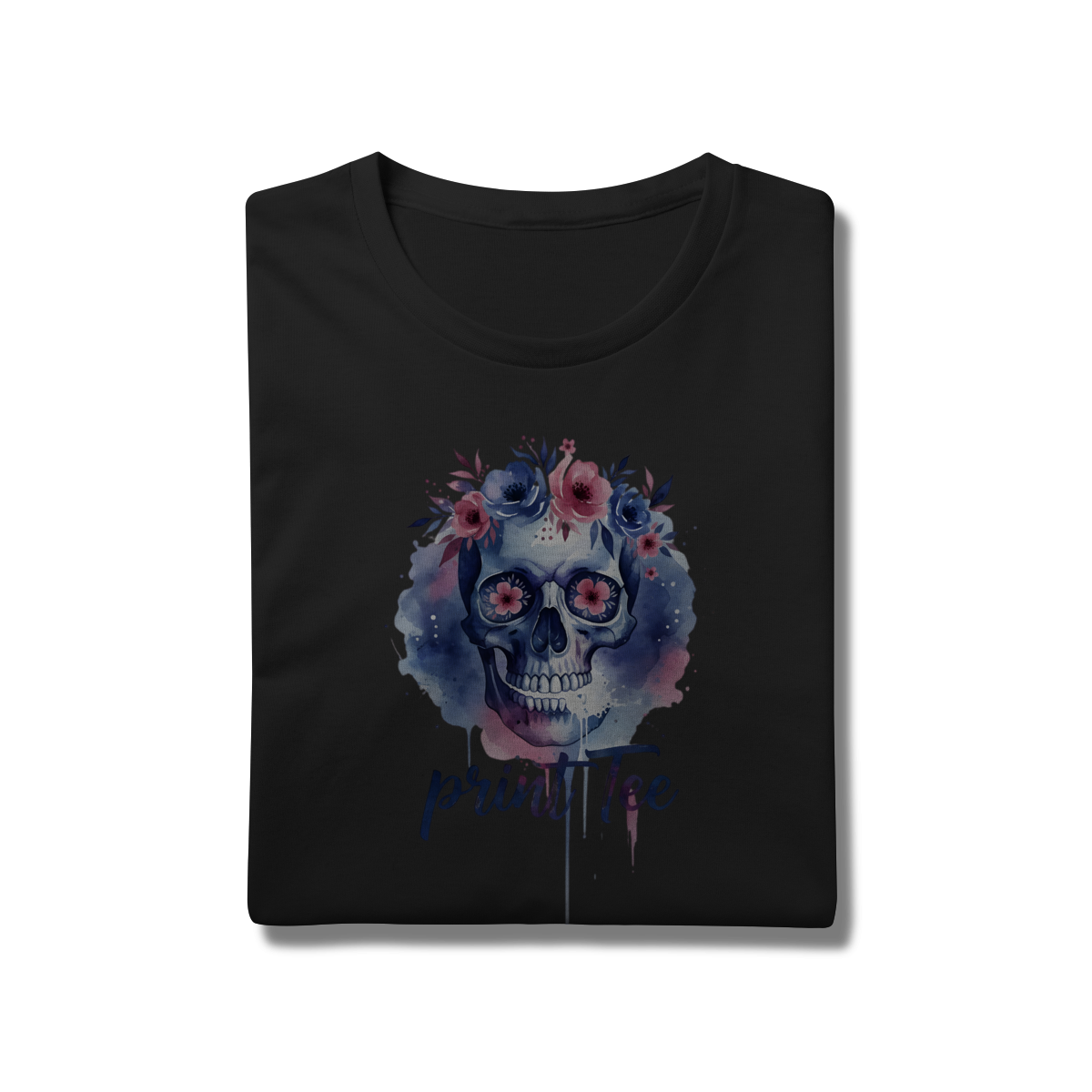Eleve seu estilo básico a um novo patamar de sofisticação. Esta peça não é apenas uma camiseta, é uma tela de expressão. Com uma estampa exclusiva em aquarela digital, o design une o simbolismo clássico do crânio à suavidade de uma coroa floral em tons de lavanda, rosa e azul profundo.