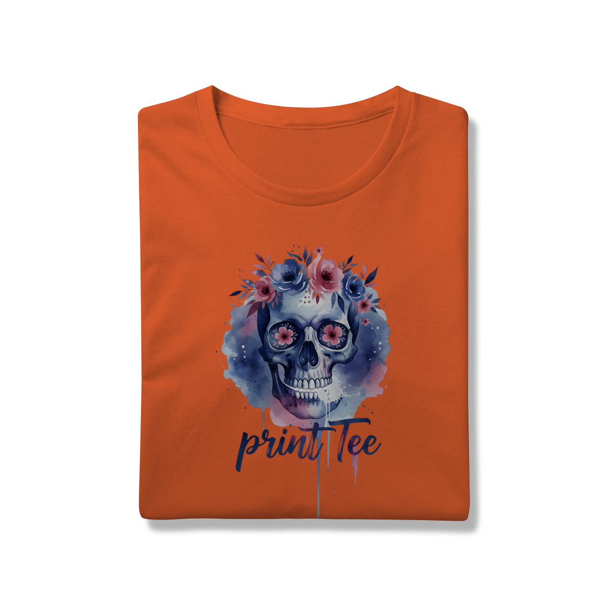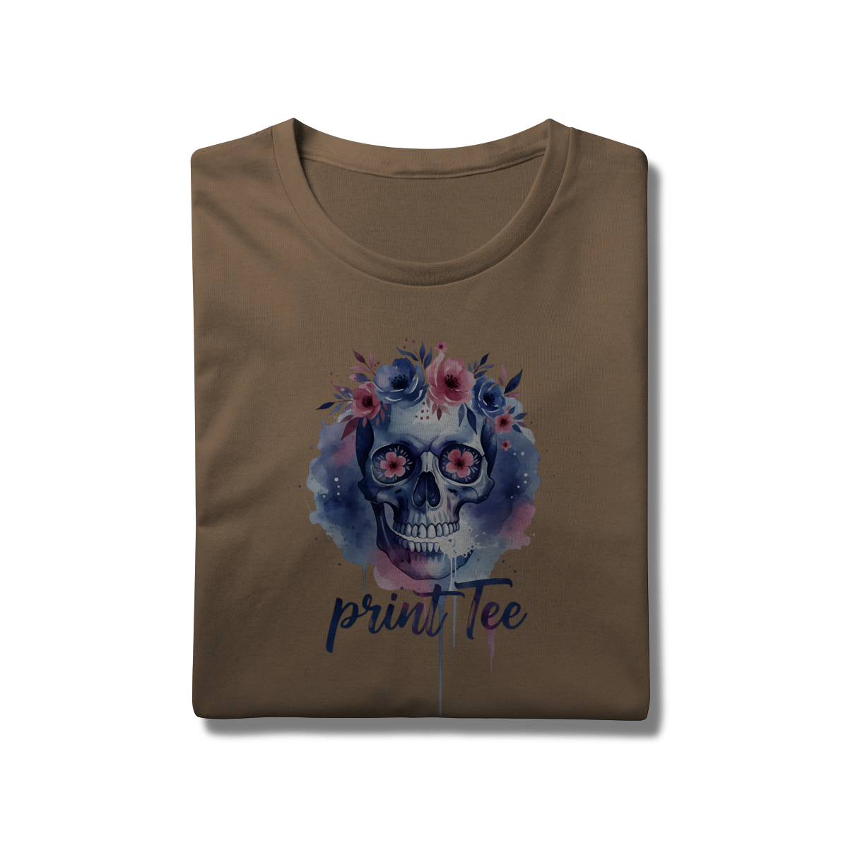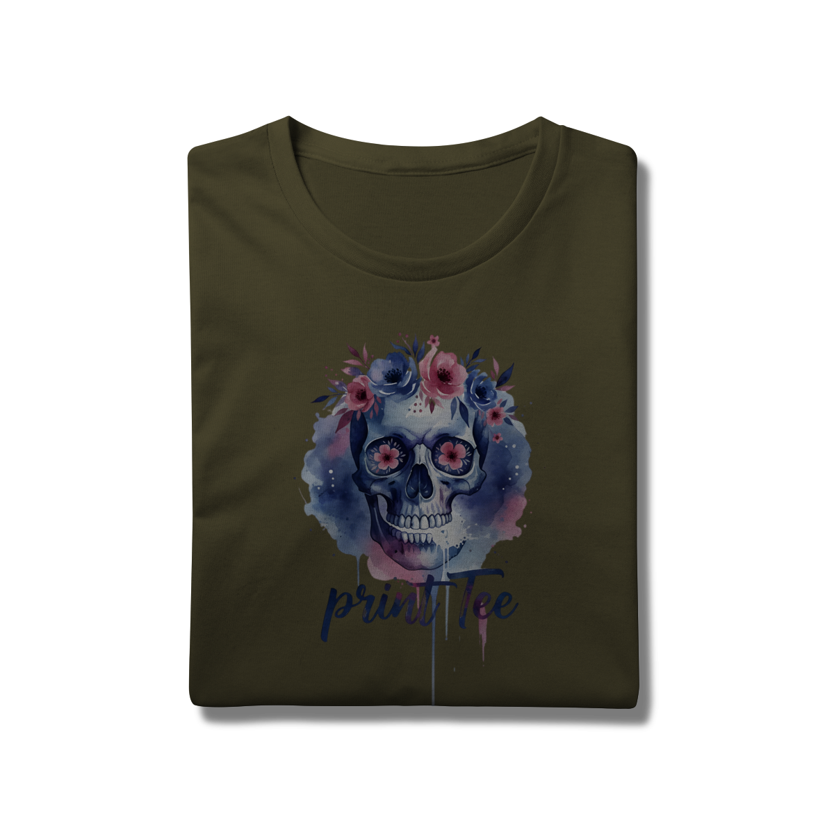 Eleve seu estilo básico a um novo patamar de sofisticação. Esta peça não é apenas uma camiseta, é uma tela de expressão. Com uma estampa exclusiva em aquarela digital, o design une o simbolismo clássico do crânio à suavidade de uma coroa floral em tons de lavanda, rosa e azul profundo.