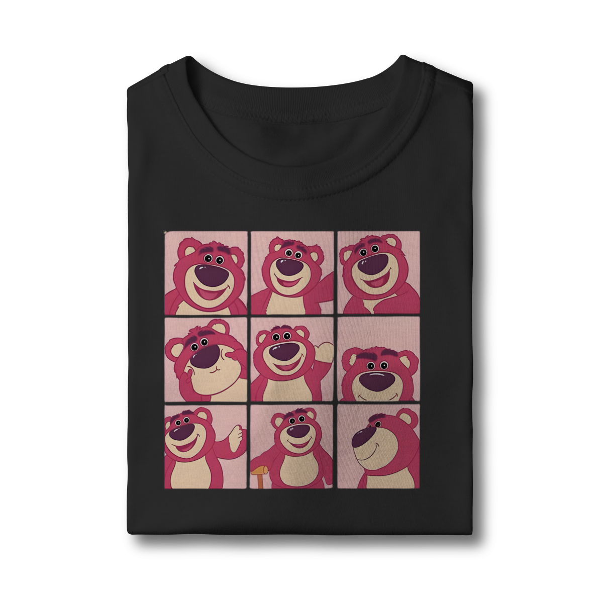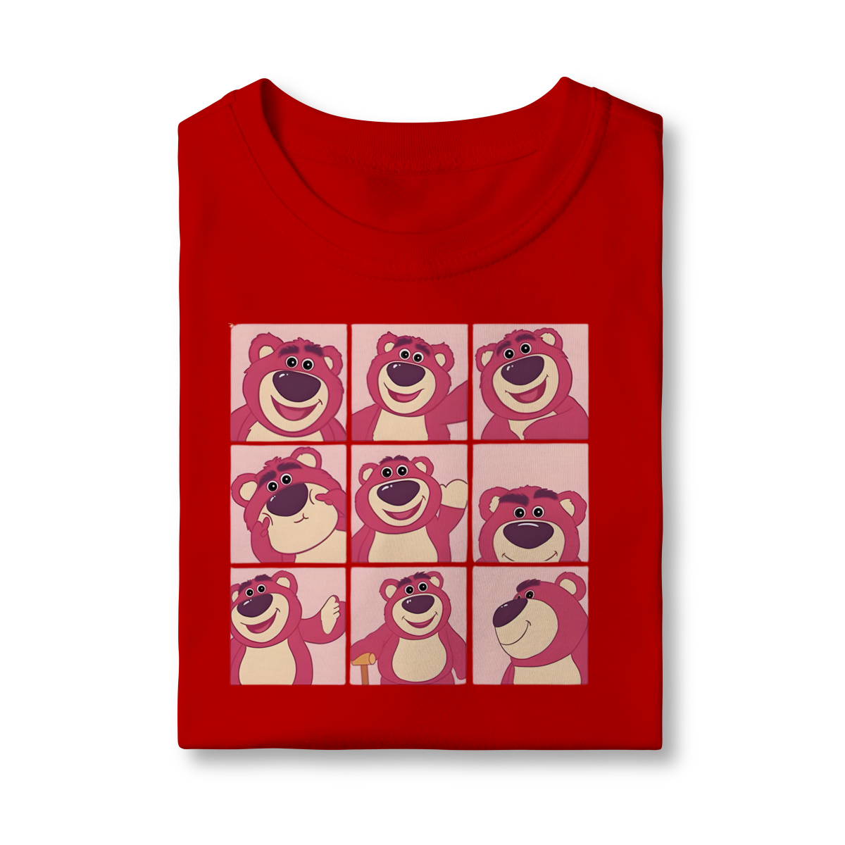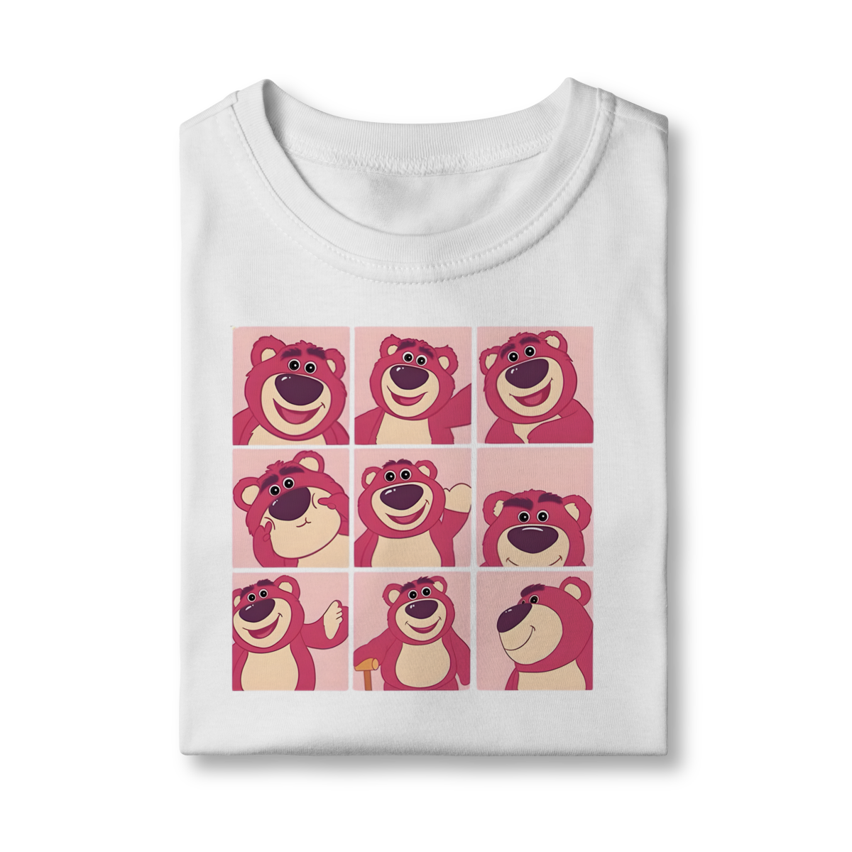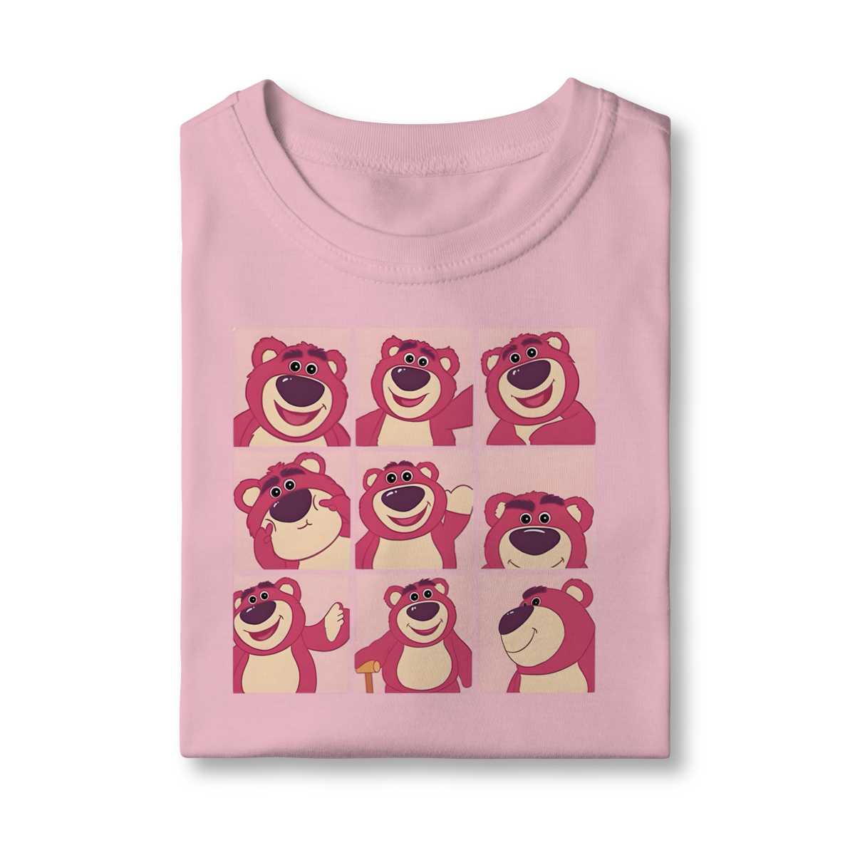 A estampa central é um "mood board" ou grade 3x3 que exibe o Lotso em nove expressões e poses diferentes – desde o sorriso encantador até olhares mais travessos. O contraste do rosa-claro da estampa com o fúcsia ousado da camiseta cria um visual divertido e inesquecível.