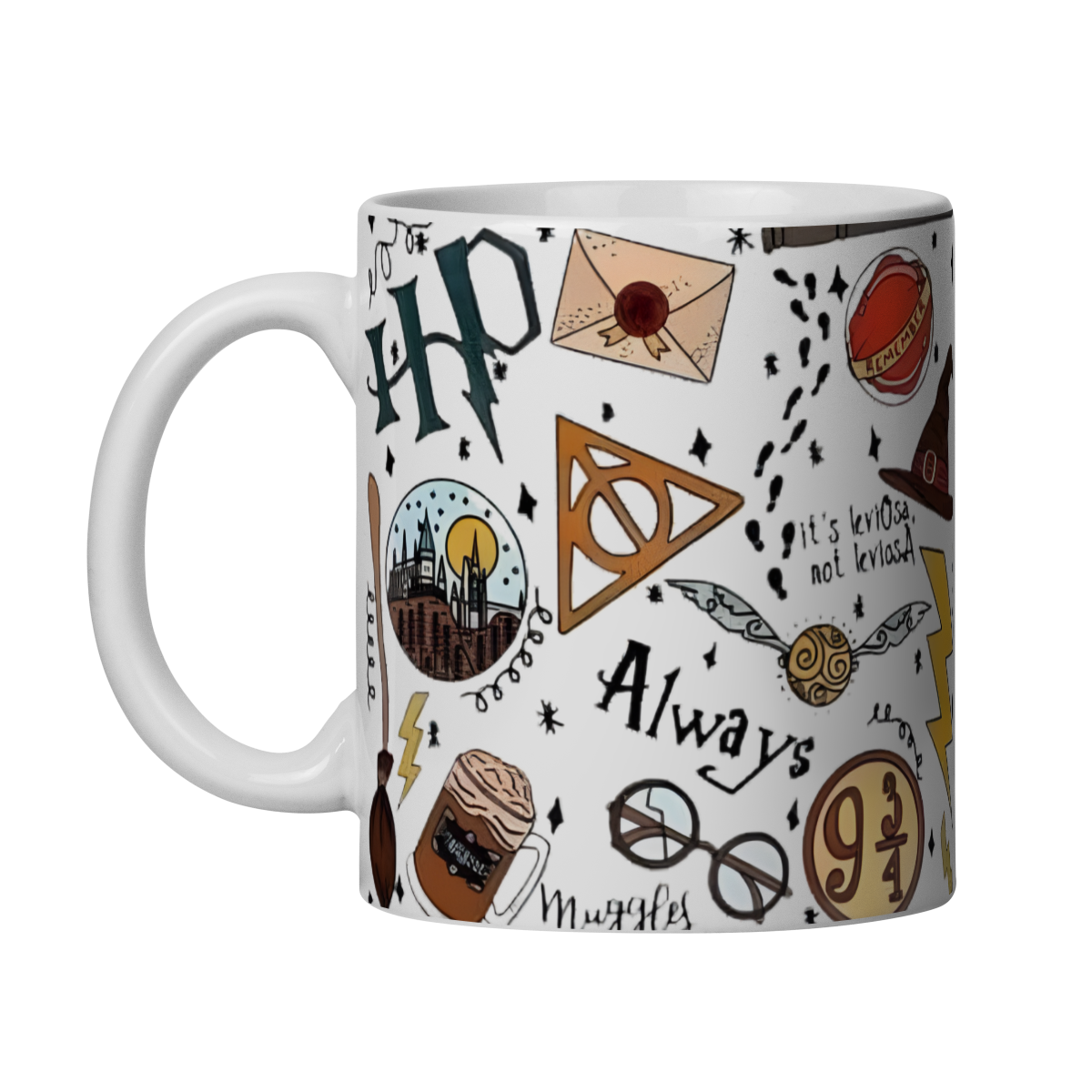 Traga um pouco de magia para o seu café da manhã ou chá da tarde com esta caneca exclusiva. Com uma estética de ilustração feita à mão (doodle), ela reúne os símbolos mais icônicos da jornada de Harry Potter em um design divertido e nostálgico.