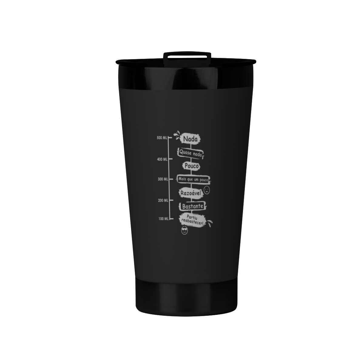 Do "Nada" (copo cheio, humor ótimo) ao "Partiu reabastecer!" (copo vazio, emergência detectada), este copo é o companheiro ideal para o trabalho, churrascos ou dias de lazer.
