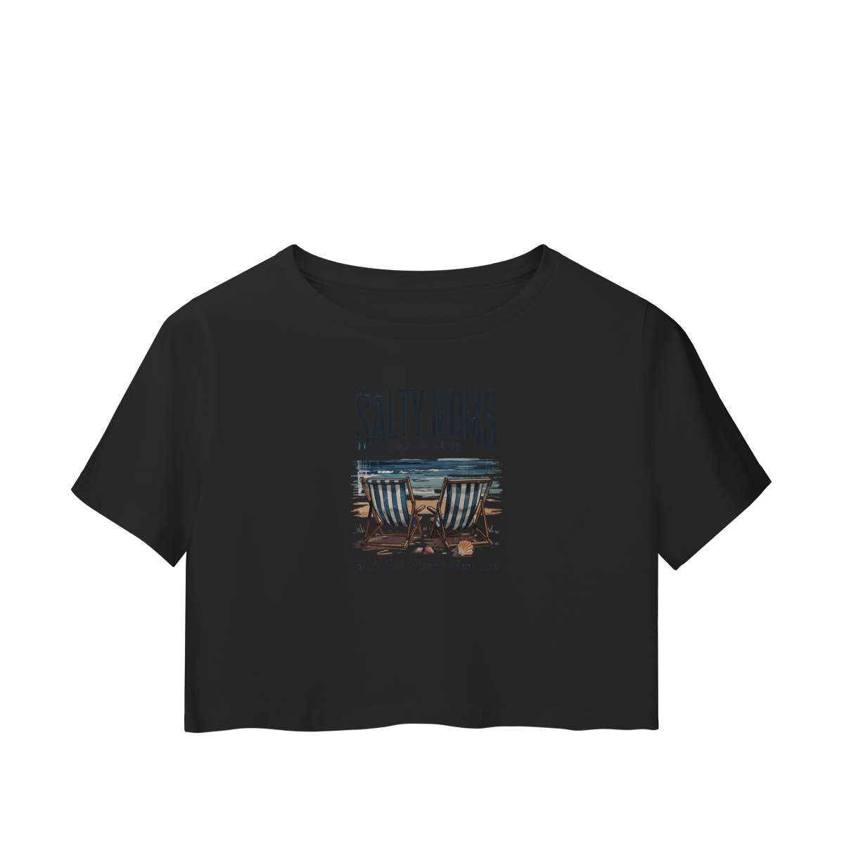 O Cropped Salty Sands foi feito para quem carrega o espírito do verão o ano inteiro. Com uma modelagem moderna e corte relaxado, ele traz uma estampa exclusiva de estilo vintage art, retratando o cenário perfeito: cadeiras de descanso à beira-mar sob o letreiro "Salty Moms Beach Club".