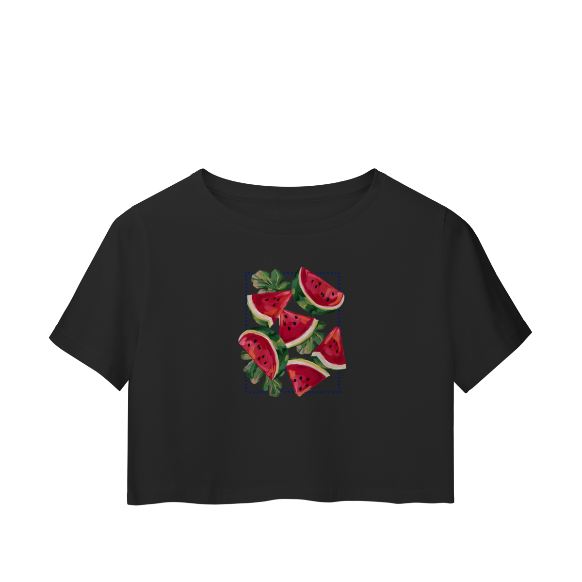 • Design Exclusivo: Apresenta uma estampa central vibrante de fatias de melancia em estilo aquarelado, emoldurada por uma delicada borda pontilhada que traz um toque retrô e artístico.