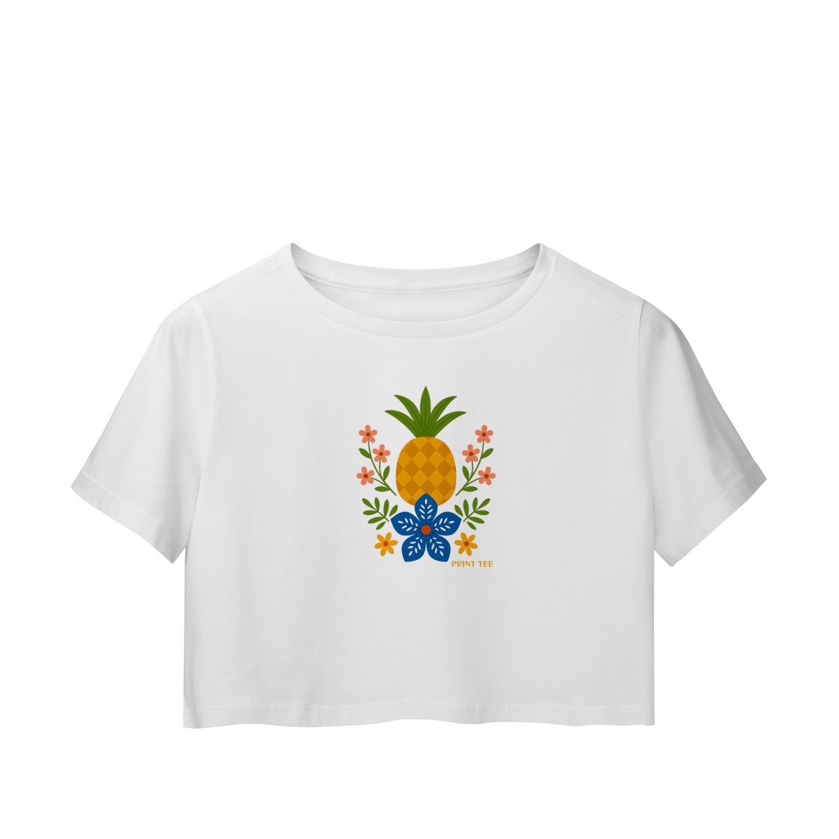 O destaque fica por conta da estampa central exclusiva, que traz uma releitura artística do abacaxi cercado por elementos florais em tons de azul safira, coral e âmbar. Com um corte moderno e caimento levemente solto, esta peça é ideal para quem busca um visual moderno, fresco e com um toque de personalidade "folk-tropical".
