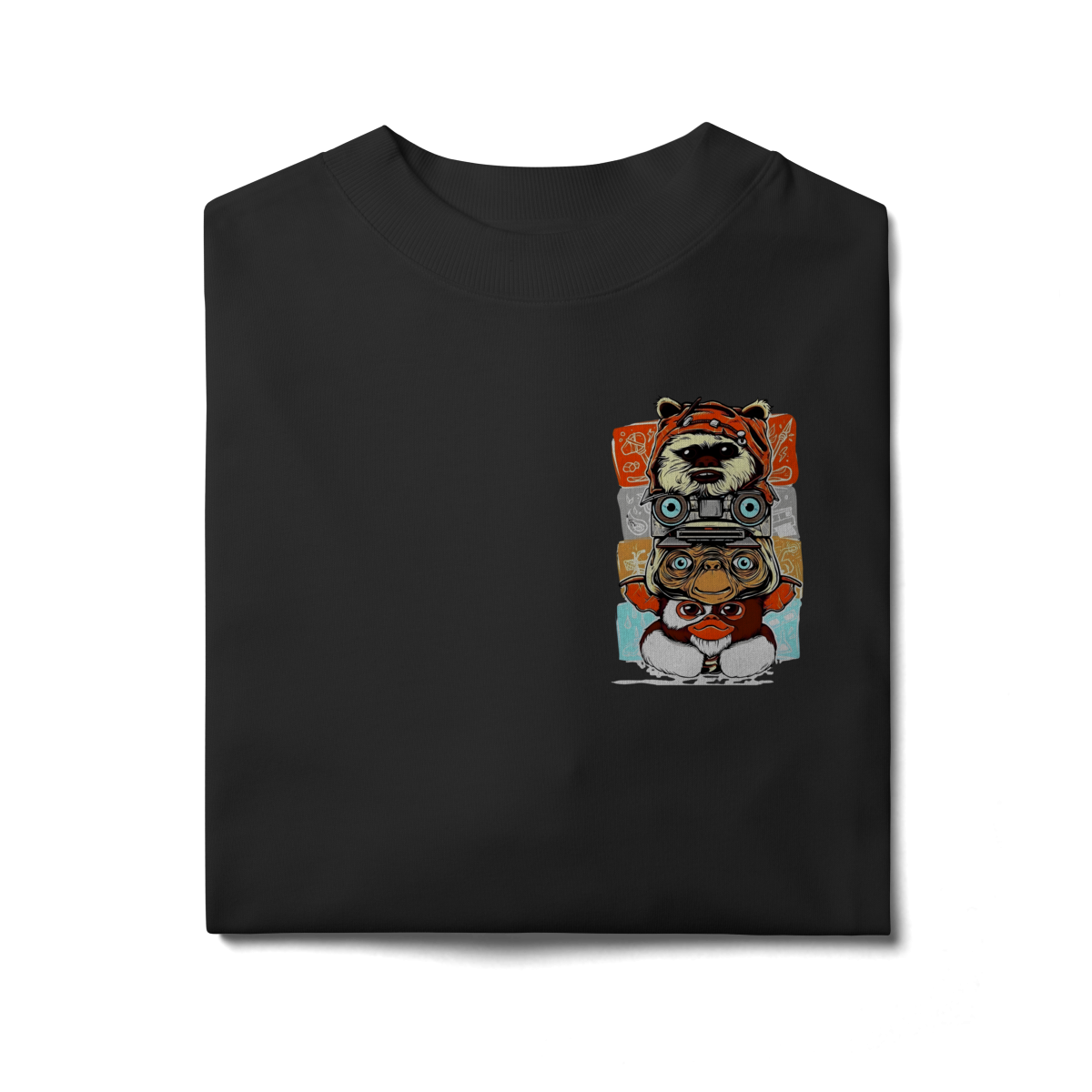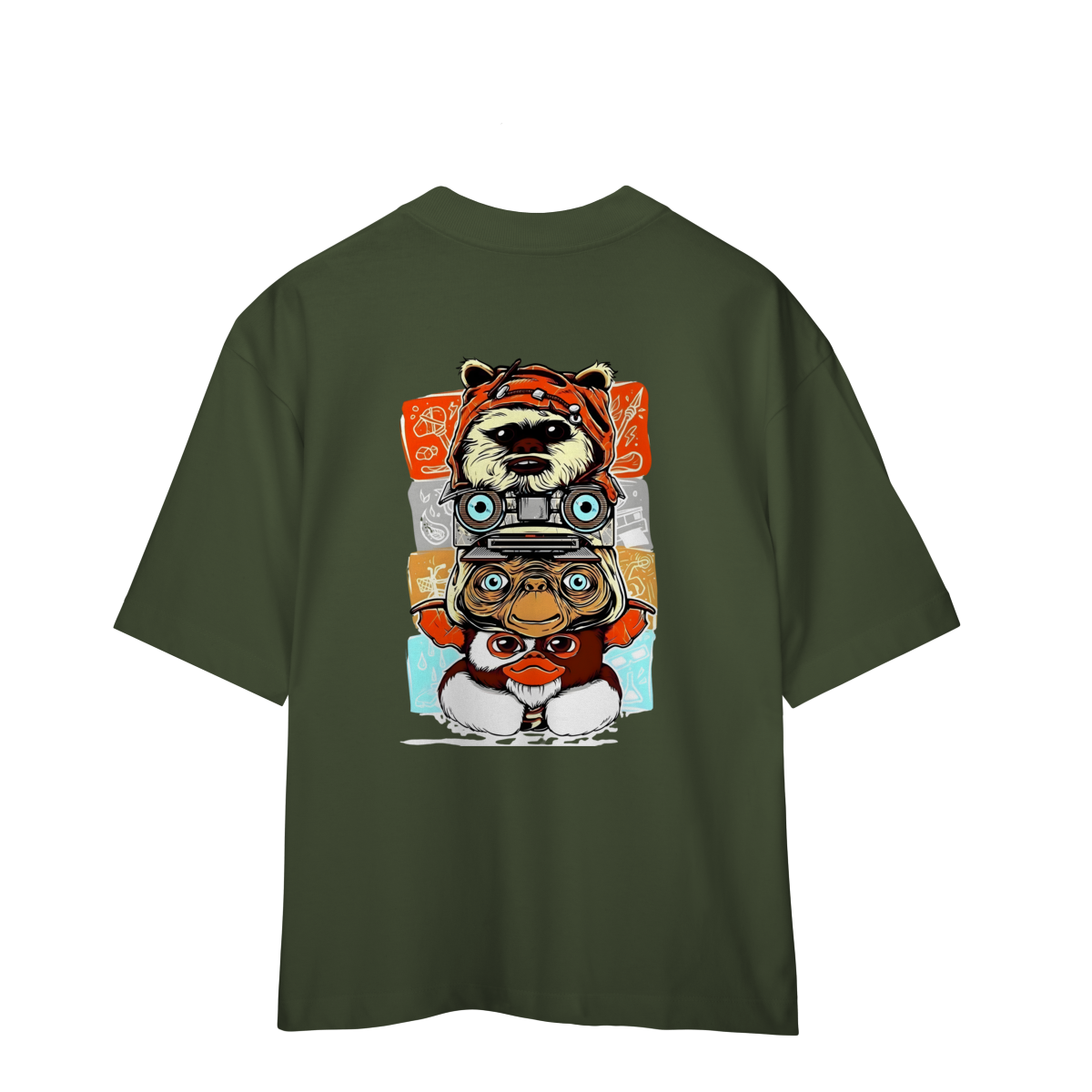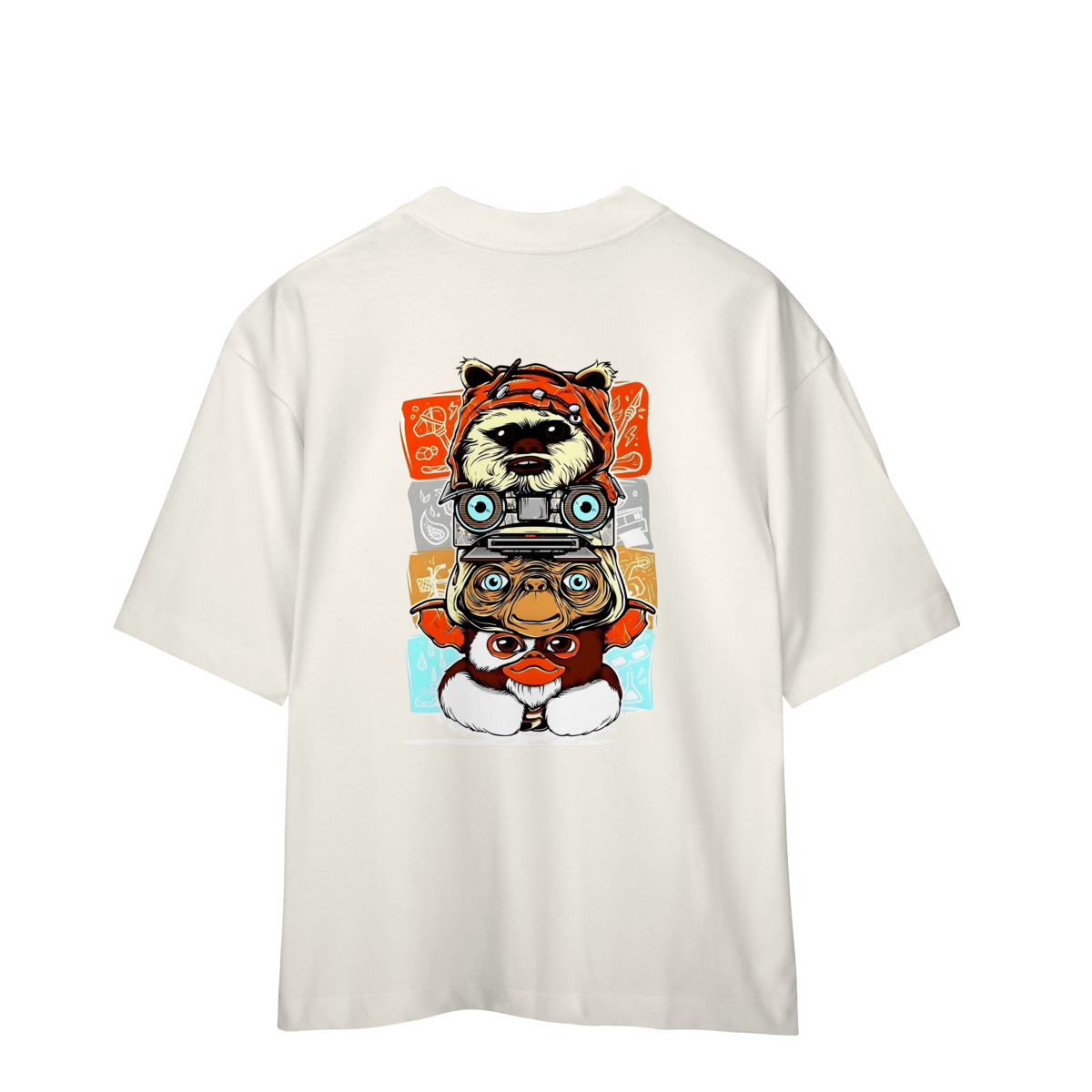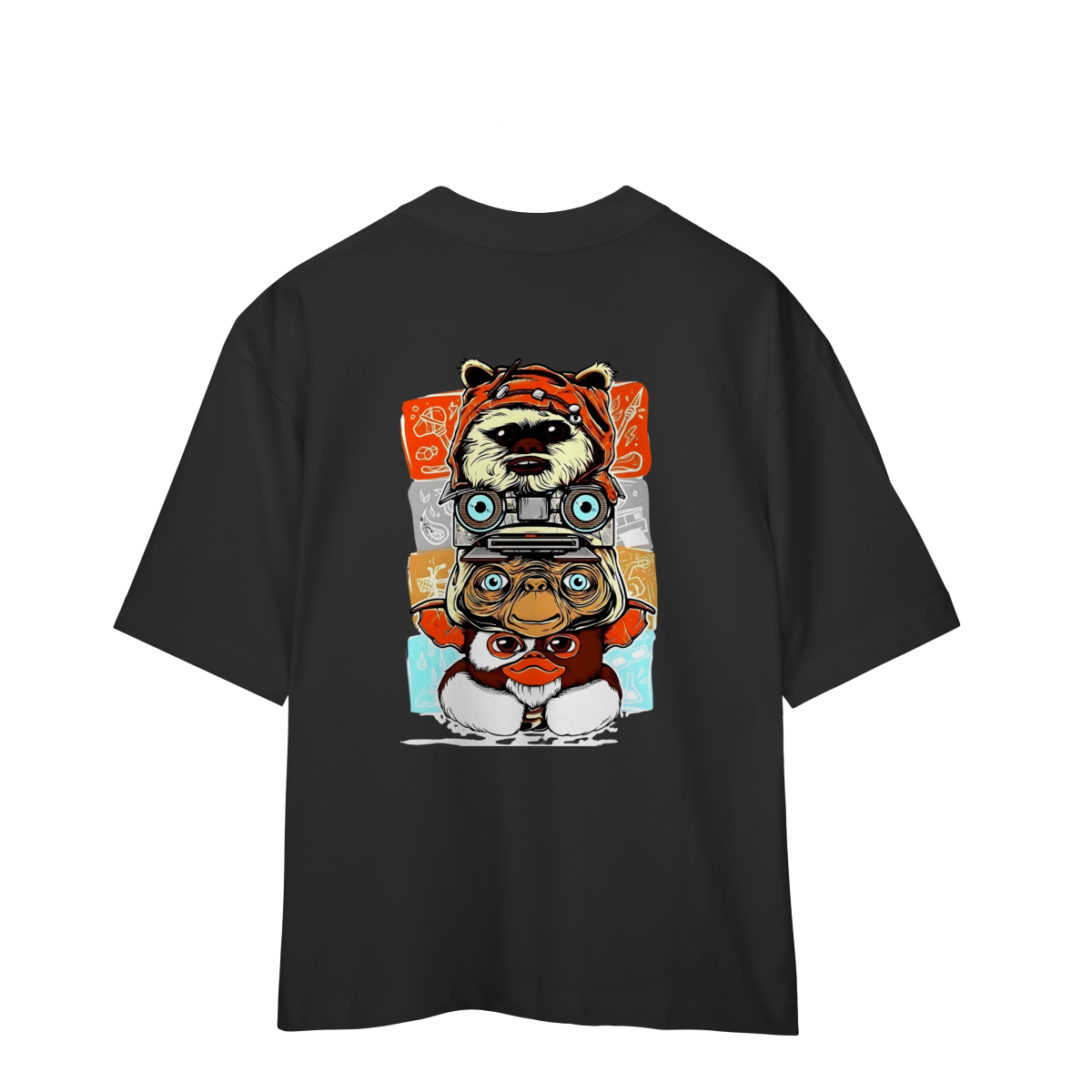 Entre para o lado mais fofo e aventureiro da galáxia com esta camiseta Oversized de tirar o fôlego! Este design exclusivo combina três das criaturas mais icônicas e adoráveis da cultura pop e do cinema em um totem divertido e cheio de atitude.