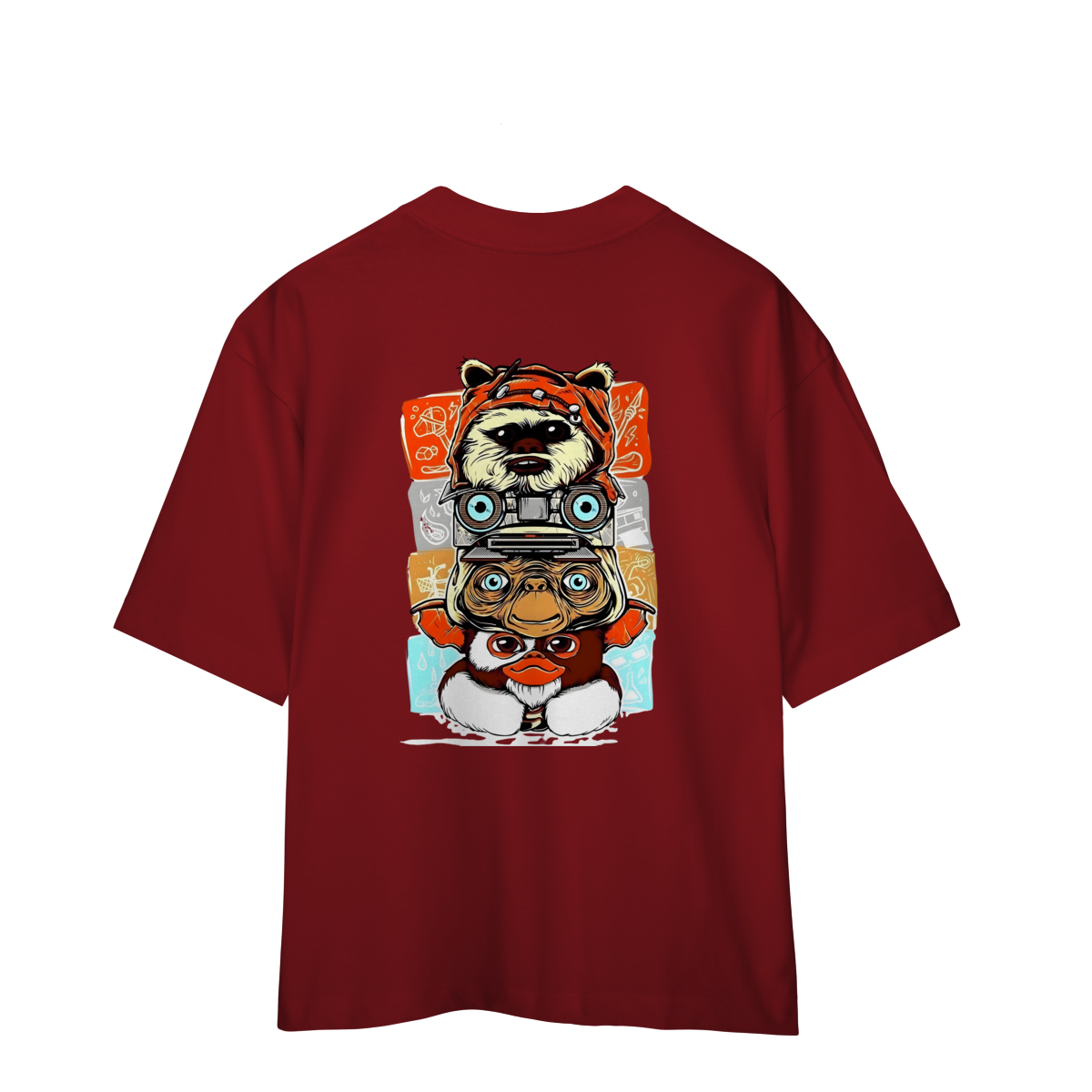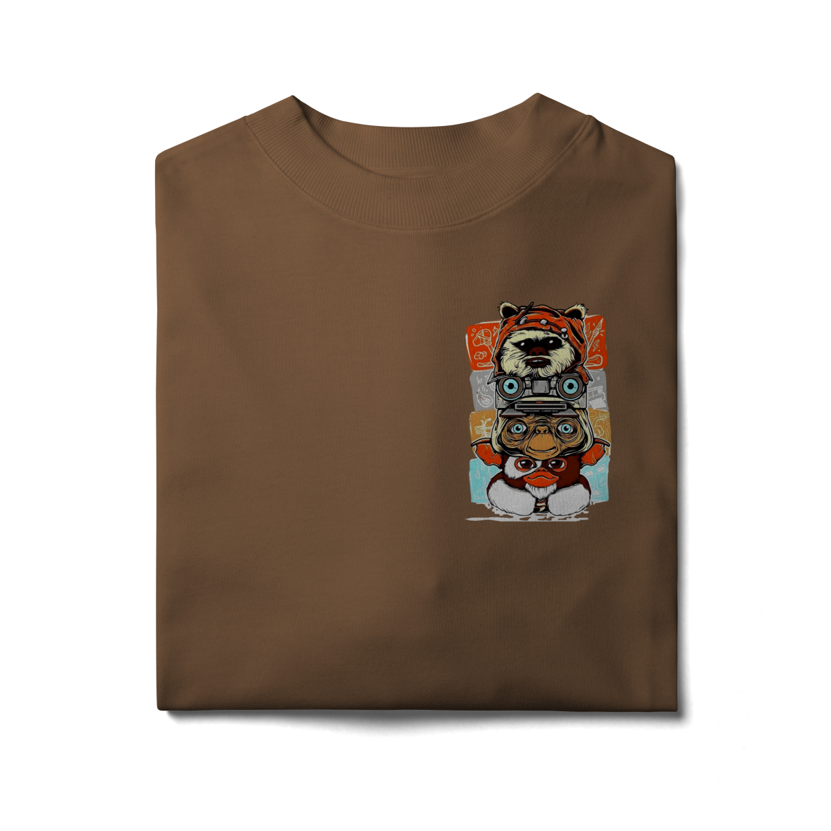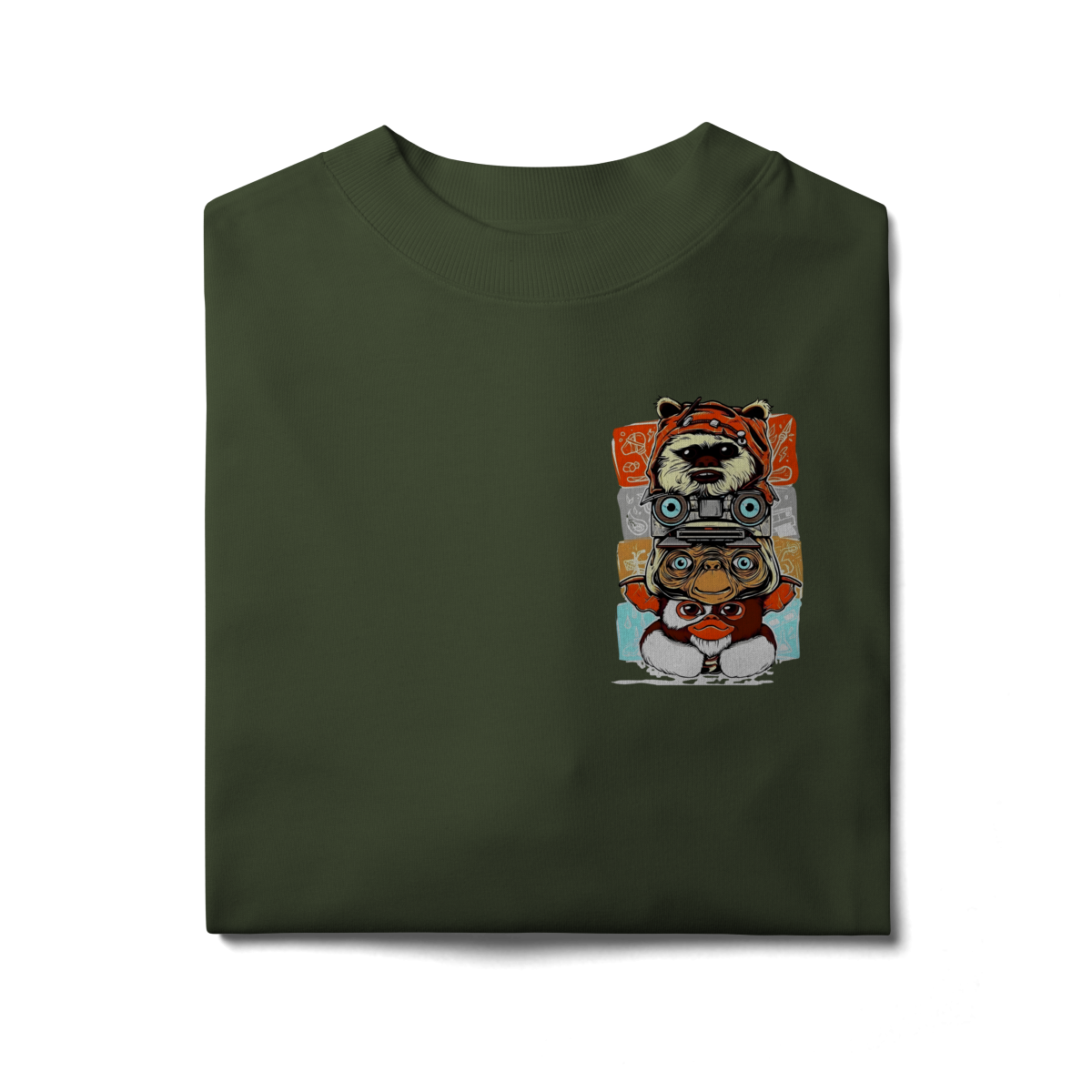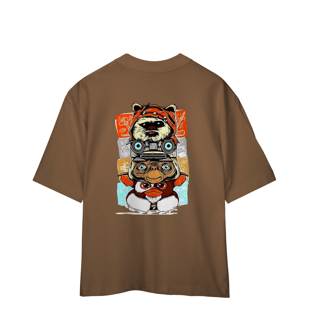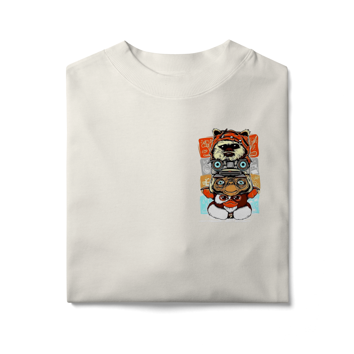 Entre para o lado mais fofo e aventureiro da galáxia com esta camiseta Oversized de tirar o fôlego! Este design exclusivo combina três das criaturas mais icônicas e adoráveis da cultura pop e do cinema em um totem divertido e cheio de atitude.