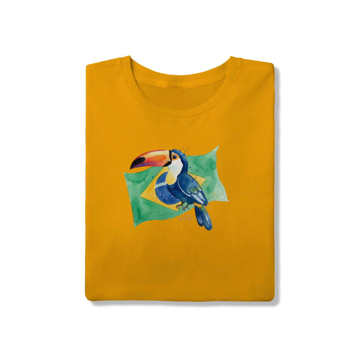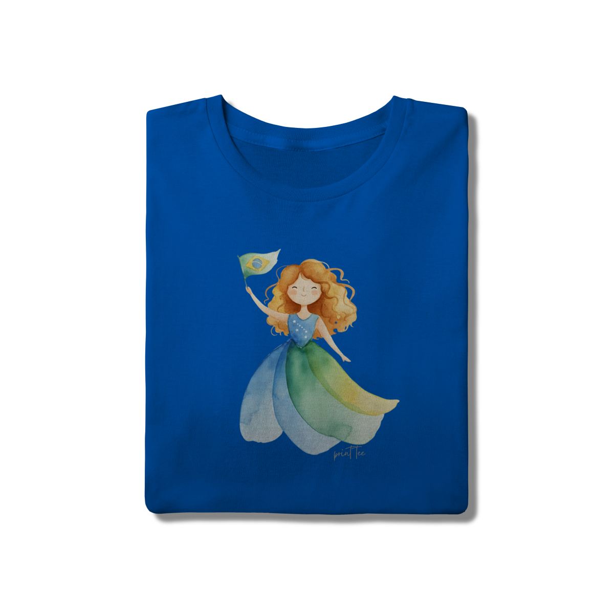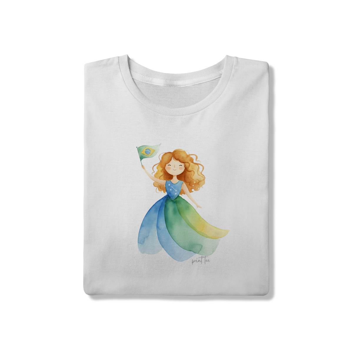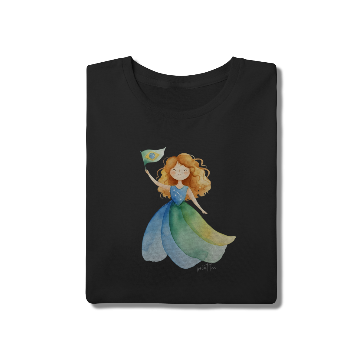 Esta peça traz uma ilustração exclusiva em estilo aquarela, apresentando uma personagem delicada que personifica a alegria e as cores da nossa terra. Com traços suaves e cores vibrantes que remetem à bandeira nacional, a estampa une o lúdico ao sofisticado.