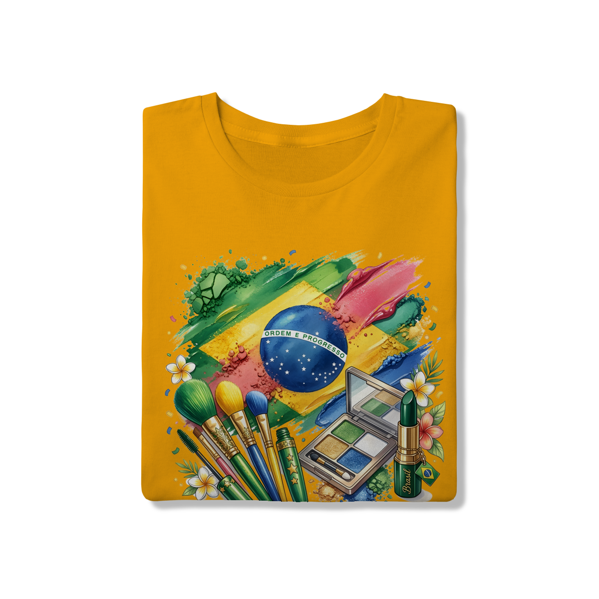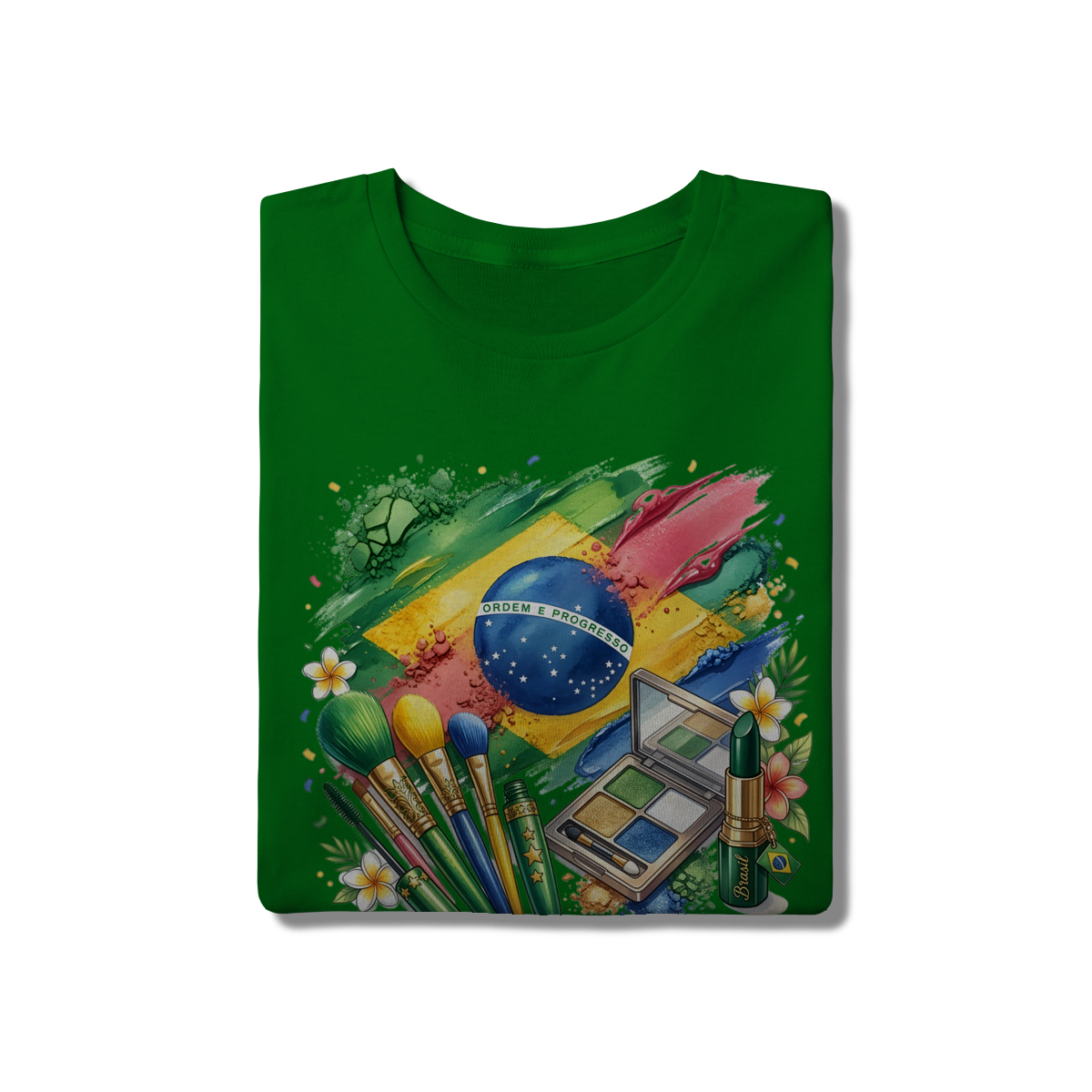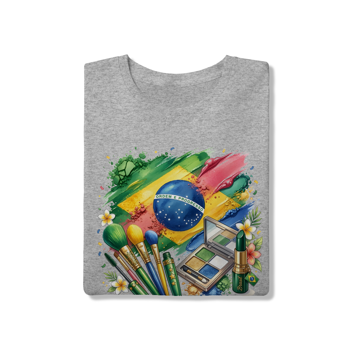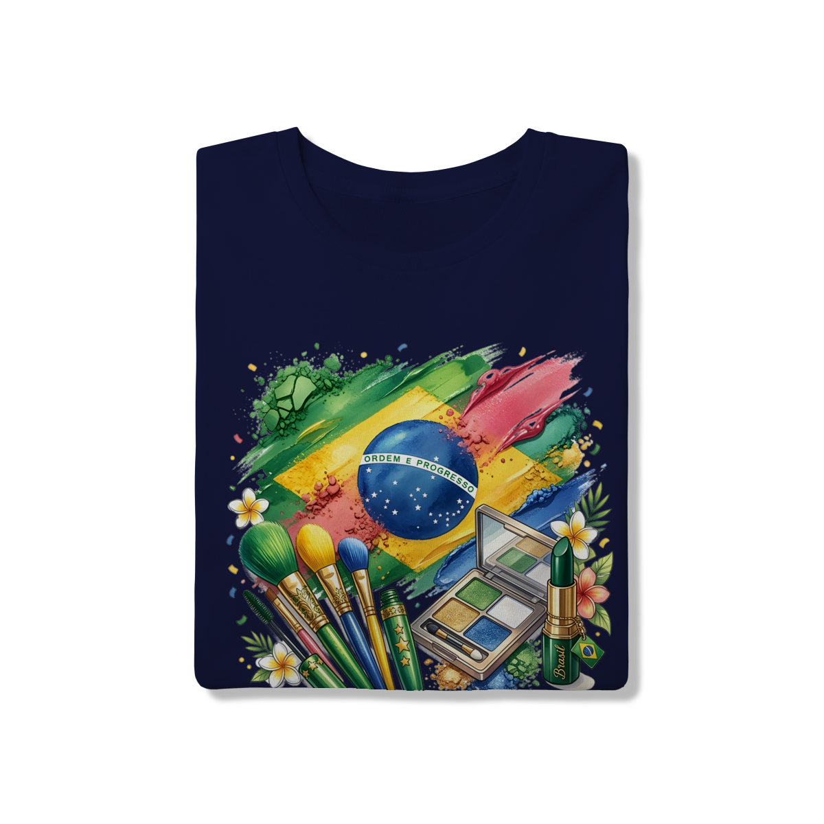 Esta peça exclusiva traz uma estampa artística vibrante, onde pincéis de maquiagem, uma paleta de sombras e batons se misturam às cores da bandeira do Brasil em um estilo aquarelado. No centro, o globo com o lema "Ordem e Progresso" ganha destaque entre texturas que remetem a pós e pigmentos de beleza. É a escolha ideal para torcedoras que não abrem mão do estilo e da feminilidade na hora de vibrar pela seleção.