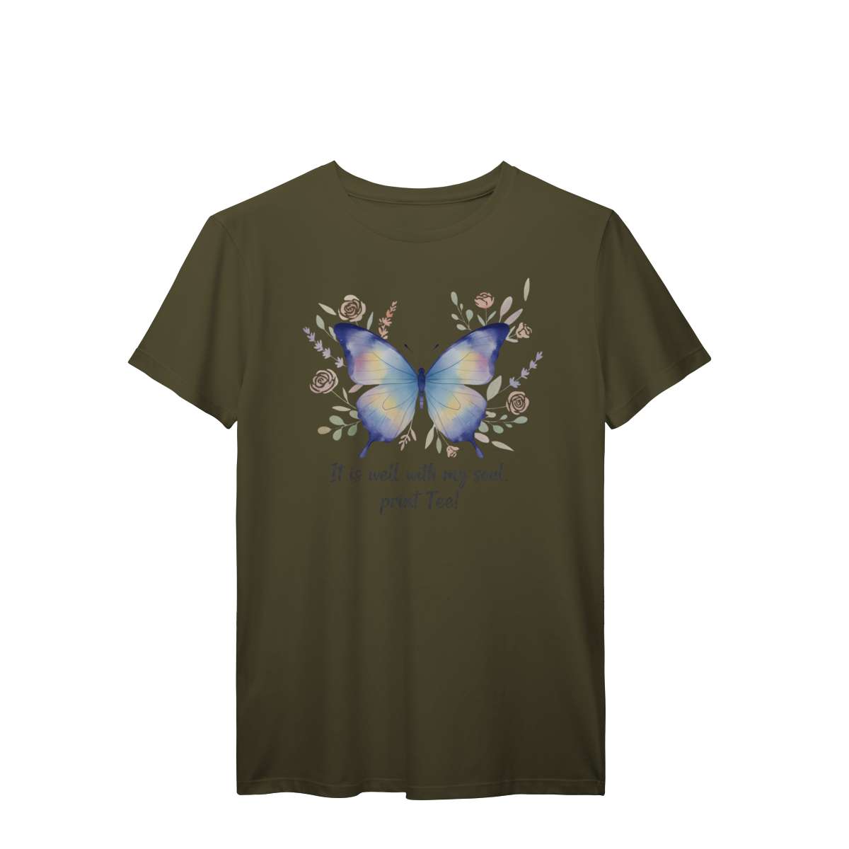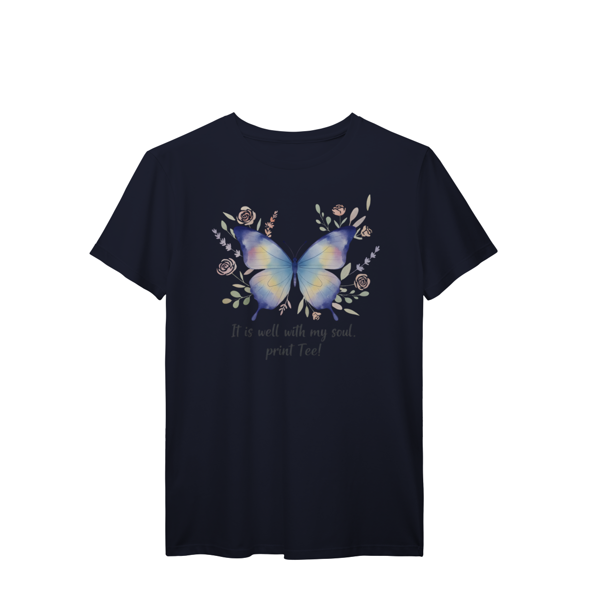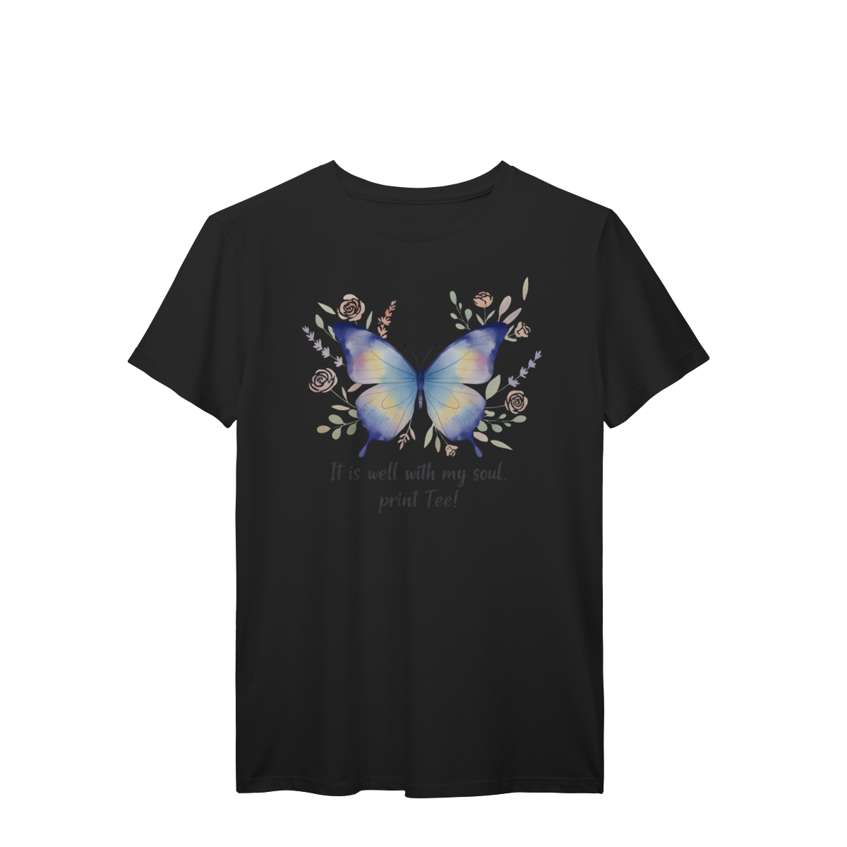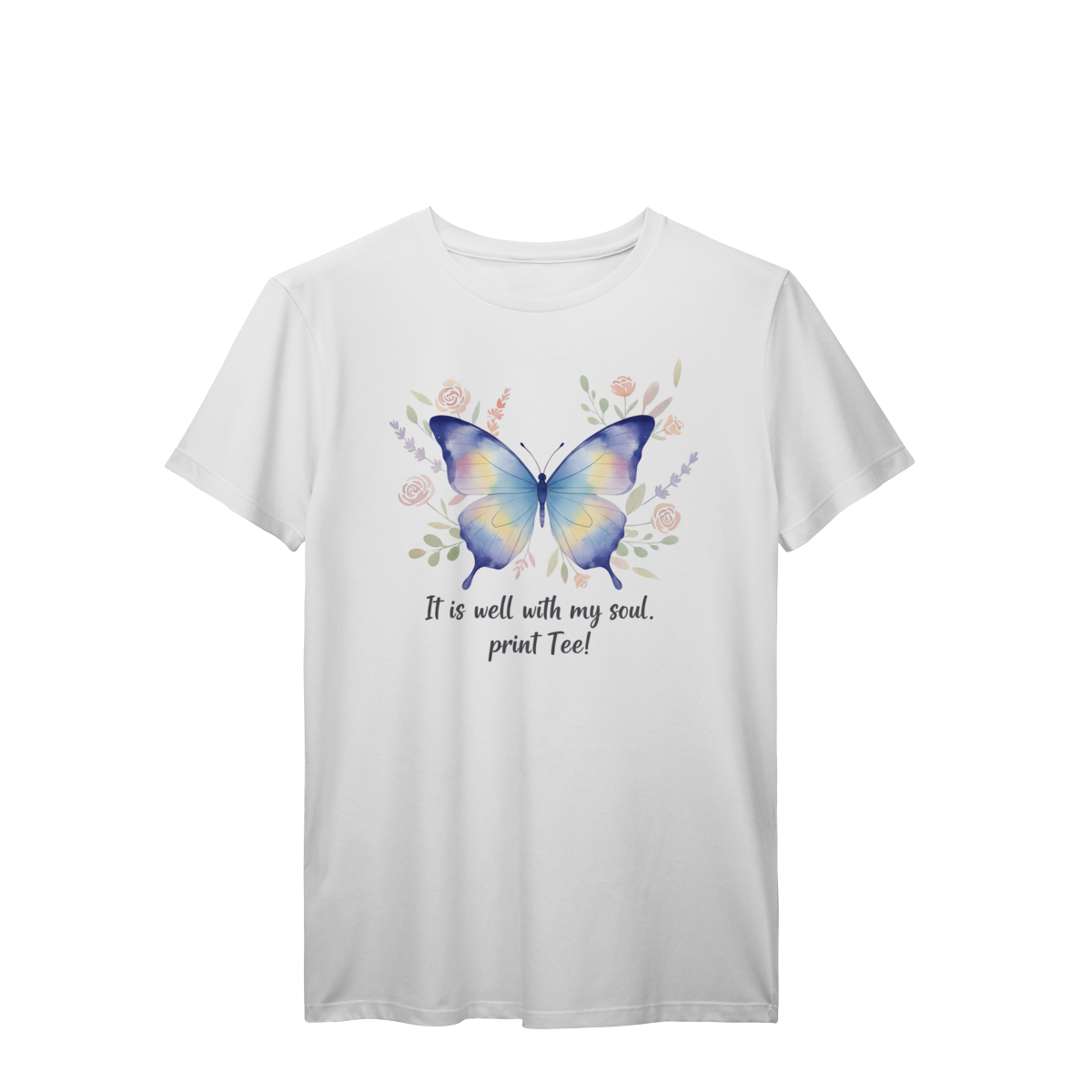 Descrição: A união perfeita entre arte e conforto. Nossa t-shirt apresenta um design artístico com tons pastéis e uma borboleta centralizada que simboliza transformação e leveza. Ideal para compor looks casuais com jeans ou saias, trazendo um ar romântico e moderno ao seu guarda-roupa. Elevando o básico ao nível de expressão pessoal.