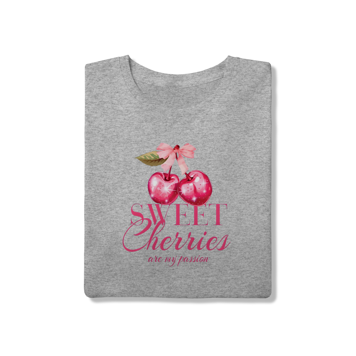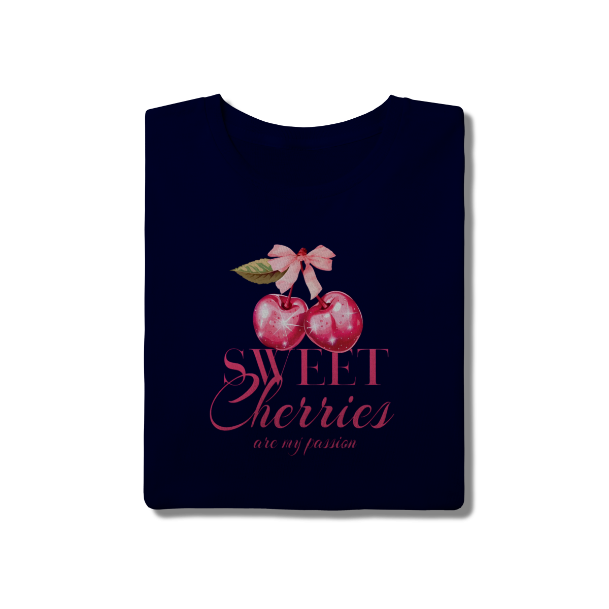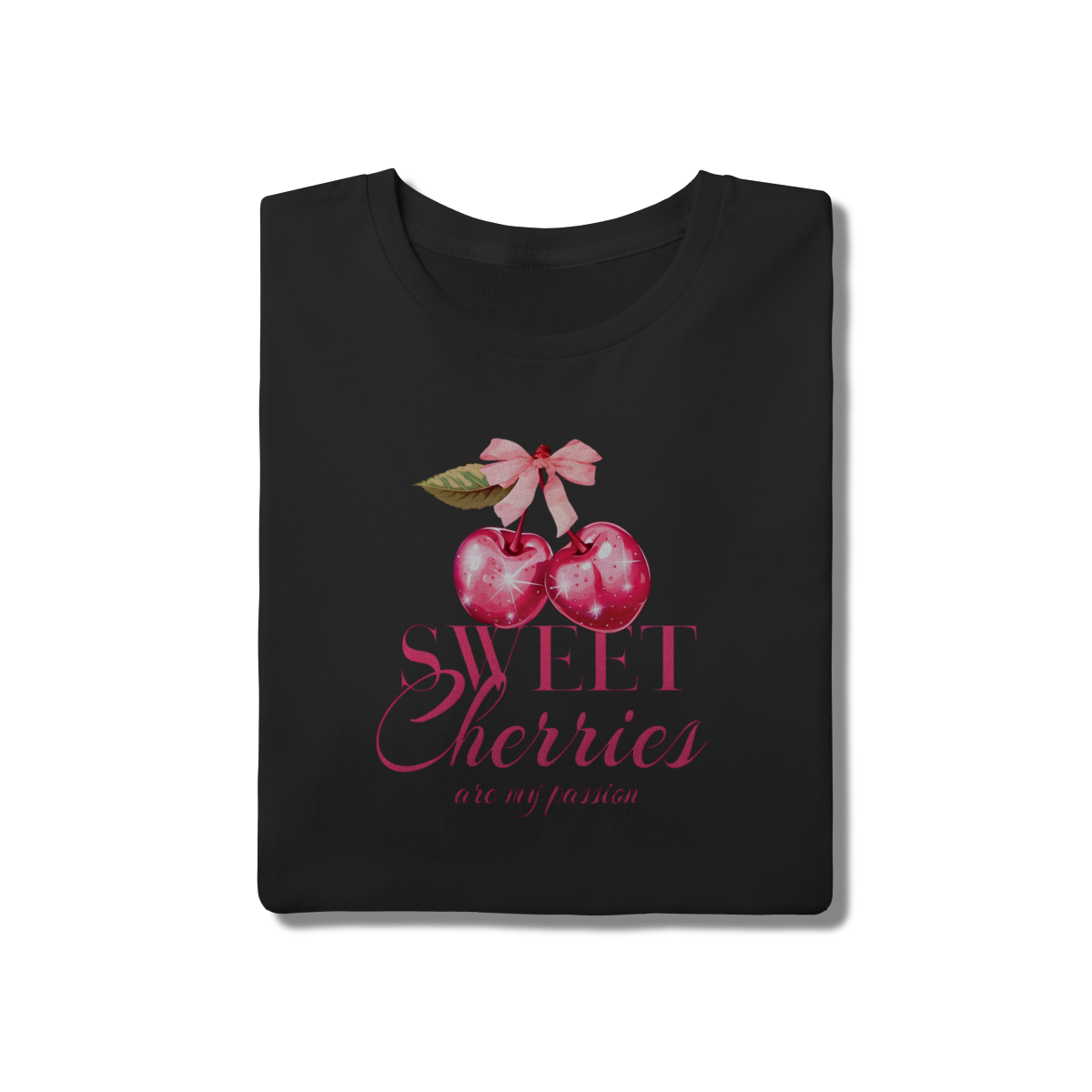 Se você é apaixonada por um toque de glamour, esta camiseta é a peça perfeita para adicionar um charme irresistível ao seu guarda-roupa. A estampa central apresenta duas cerejas brilhantes em um tom vibrante de rosa, unidas por um delicado laço de fita. Abaixo, a frase: "Sweet Cherries are my passion" (Cerejas doces são minha paixão) celebra o seu lado mais doce e apaixonado.
